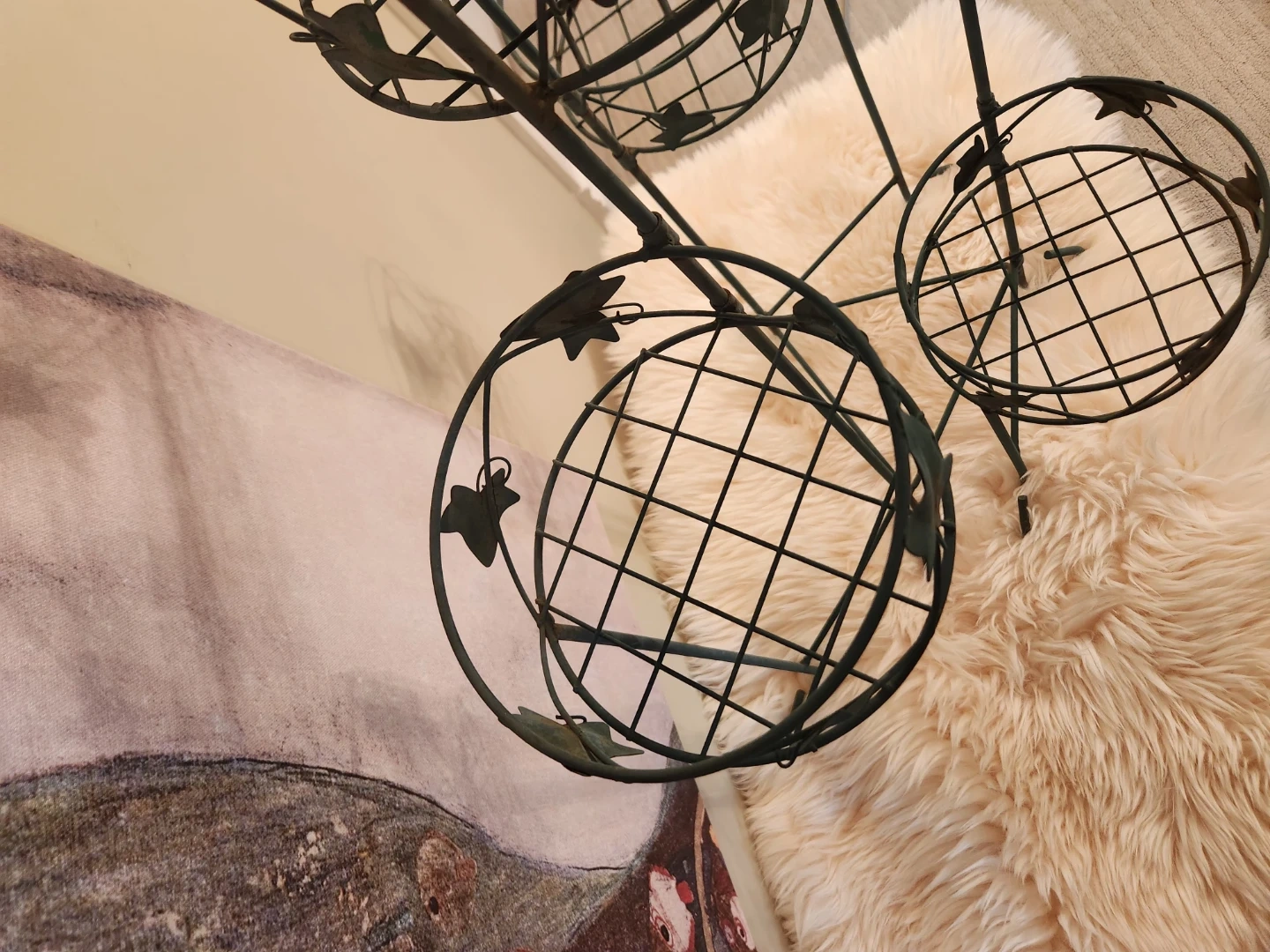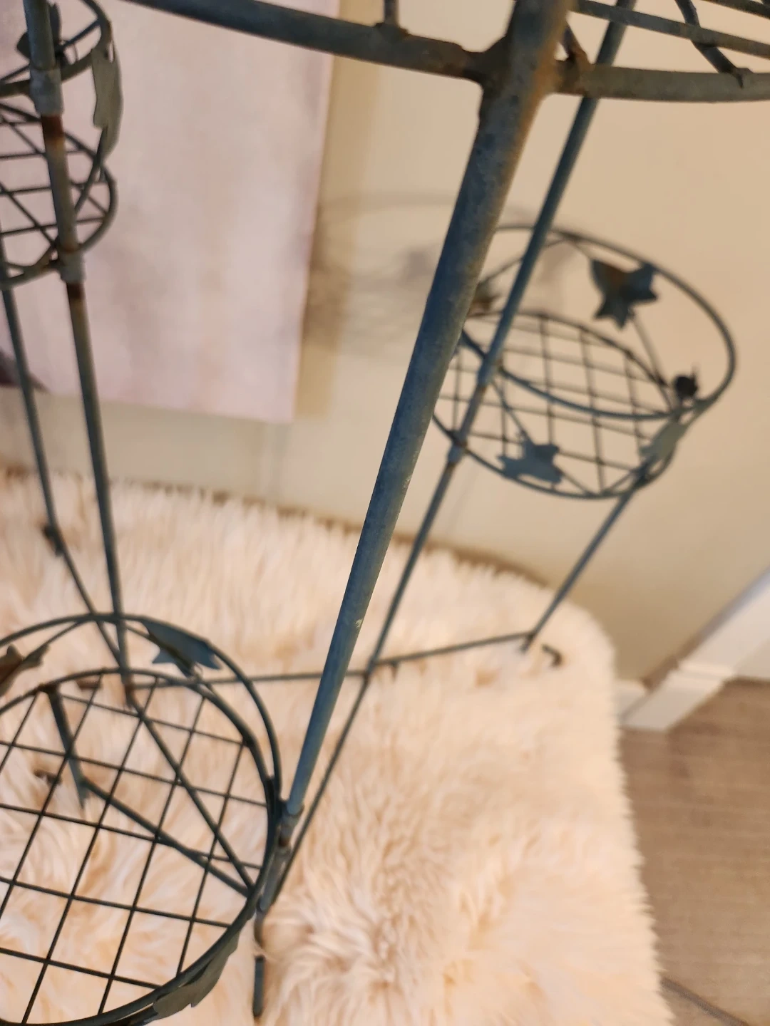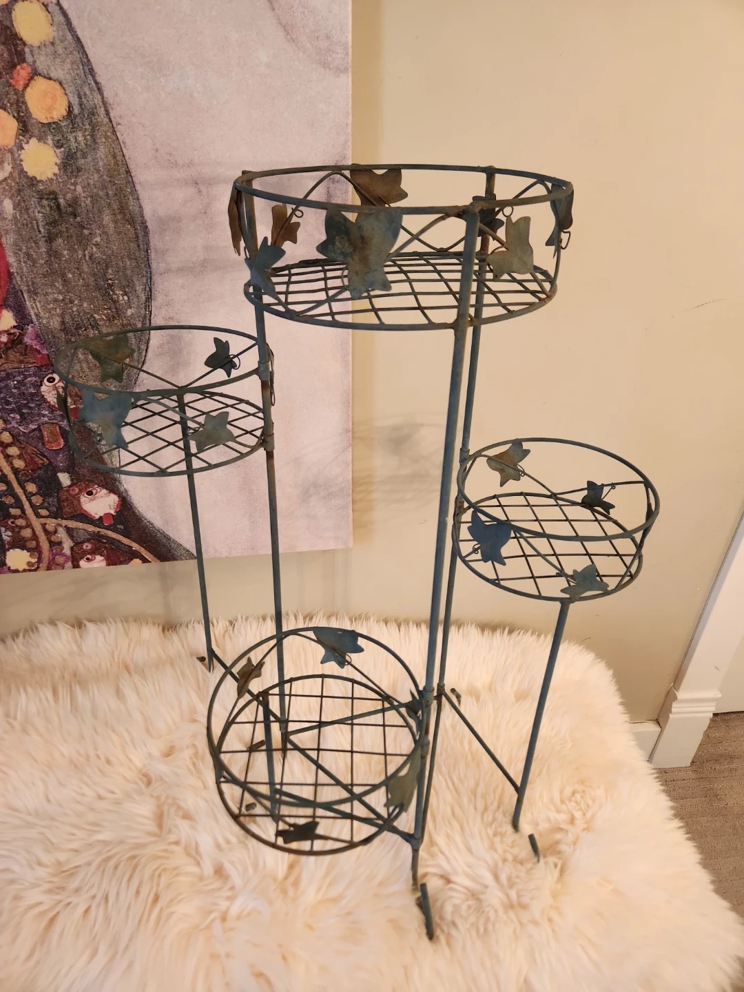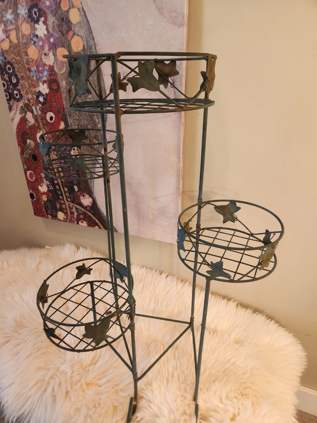 This elegant 80's metal plant stand features 4 tiers with an adjustable lower tier! A decorative leaf design and aged patina is perfect for displaying your favourite potted plants indoors or out. The sturdy construction ensures stability for your greenery!