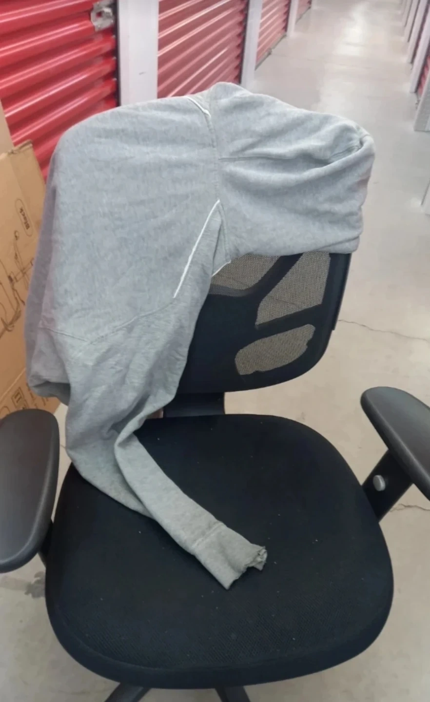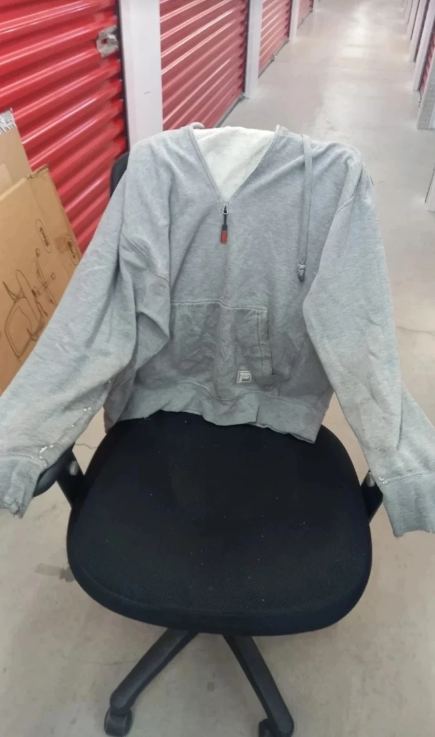 Size large. A men's, thick, gray sweatshirt/hoodie. Has a hood pullstring, chest-long zipper, and a two way pocket. Has some wear to it on the sleeves/cuffs, but is solid for casual autumn wear, fitness, or to do rough labour.