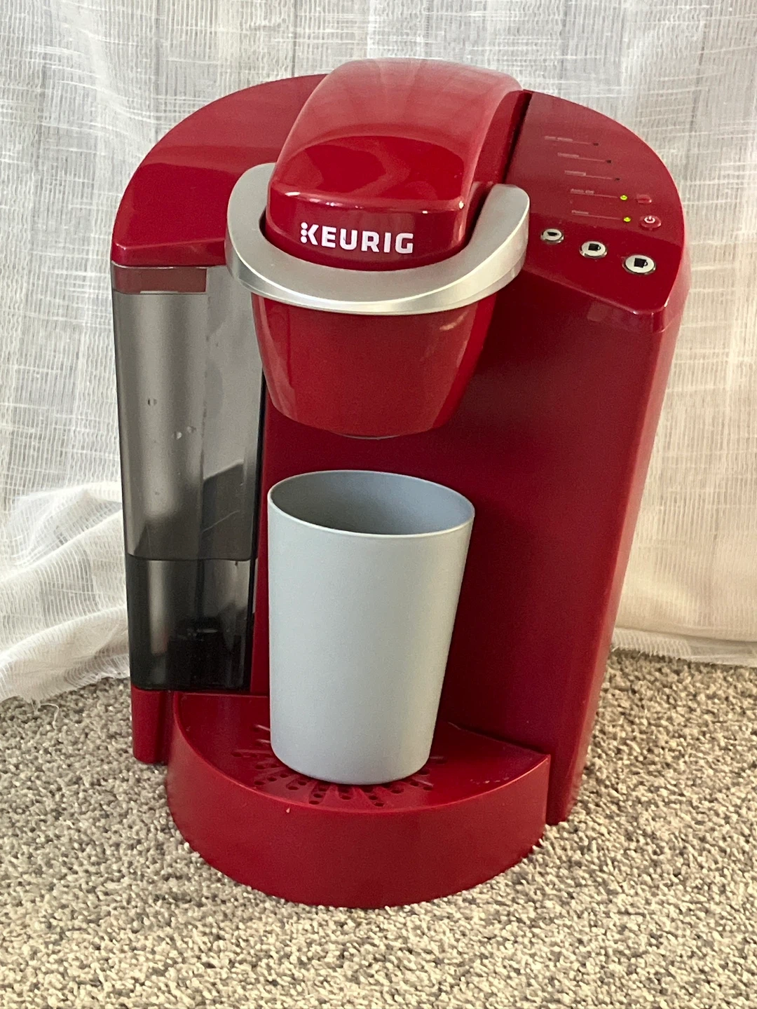 This is a red Keurig coffee maker. It's compact and perfect for any kitchen counter. Includes a removable water reservoir and drip tray.