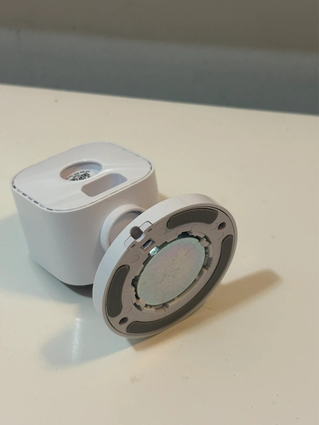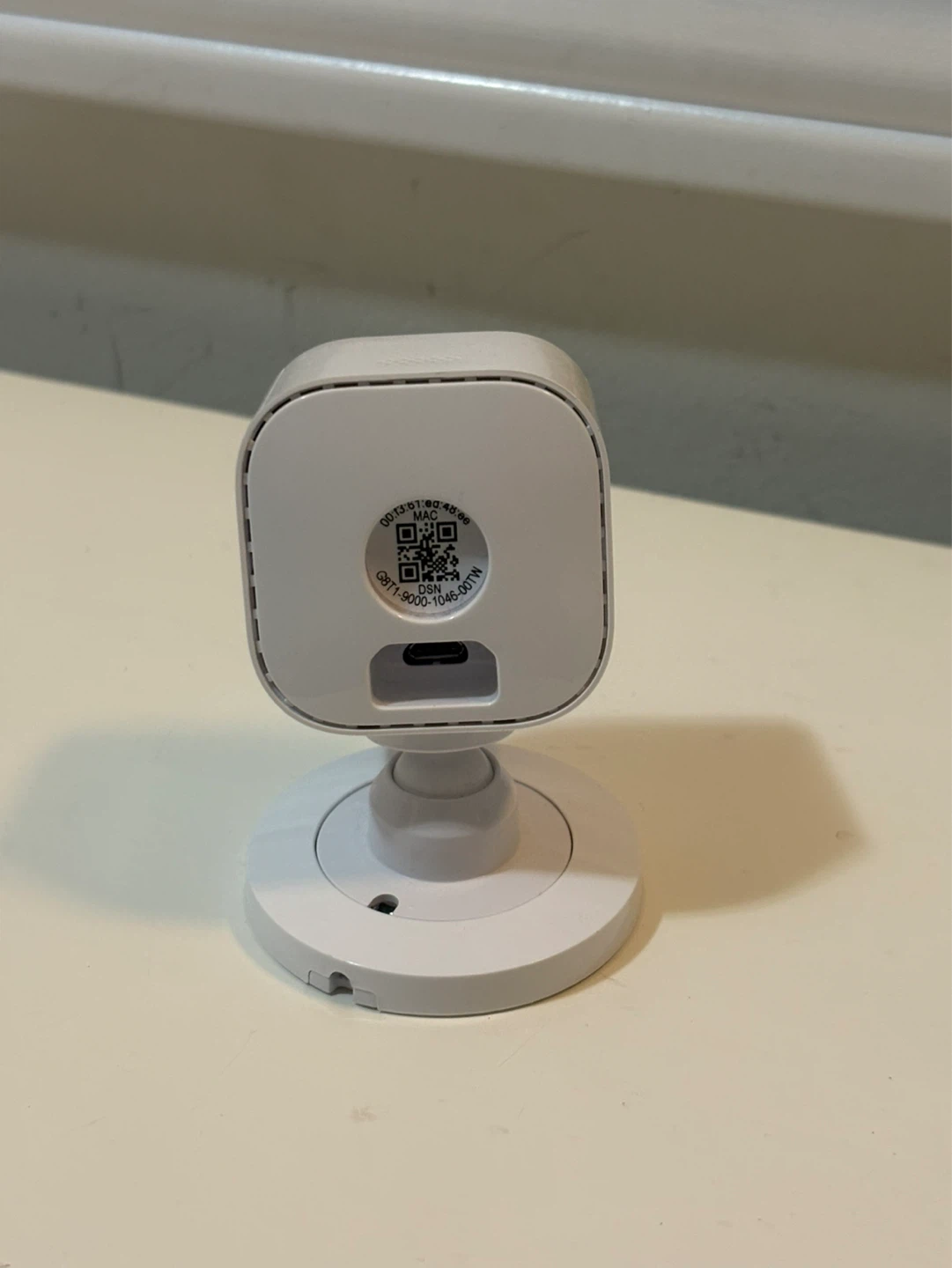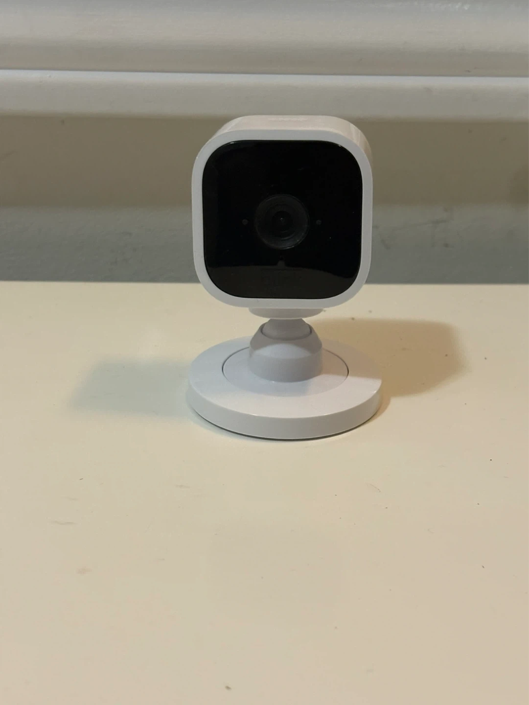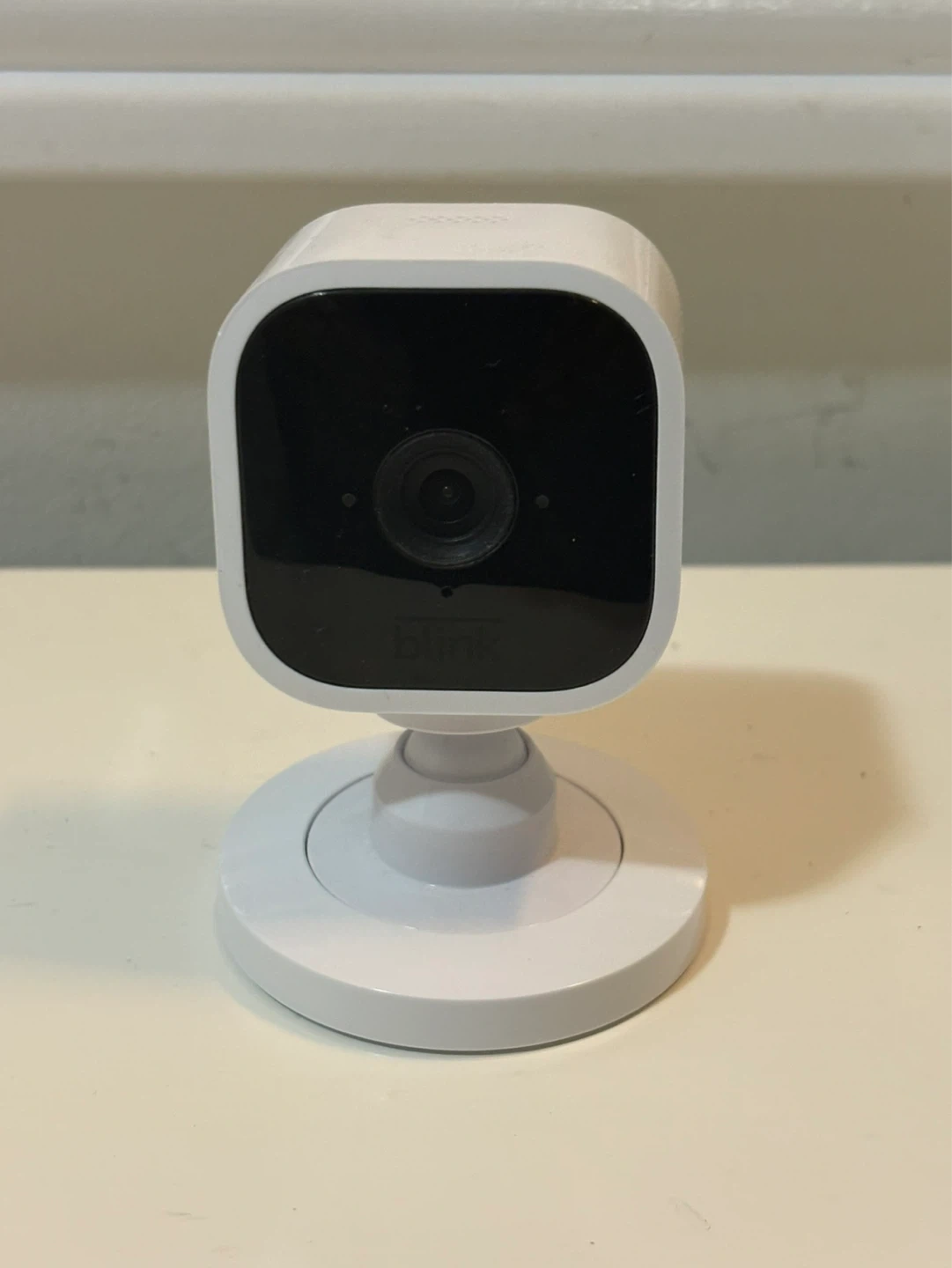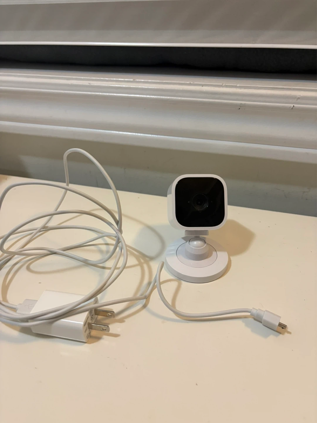 This is a white Blink Mini indoor camera. It's a 1080p smart security camera that comes with its original power adapter and USB cable. It's suitable for home monitoring!