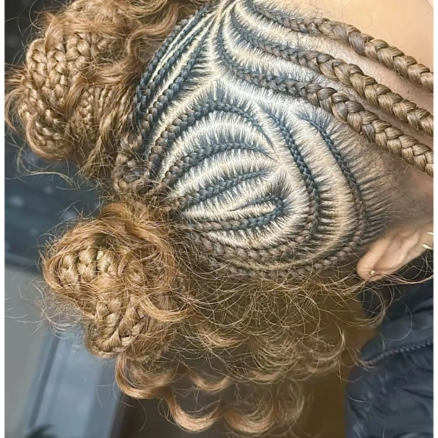 Get a unique braided hairstyle with intricate designs. Perfect for a stylish look. Offers endless styling possibilities!