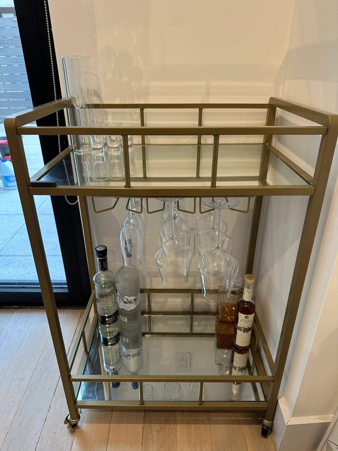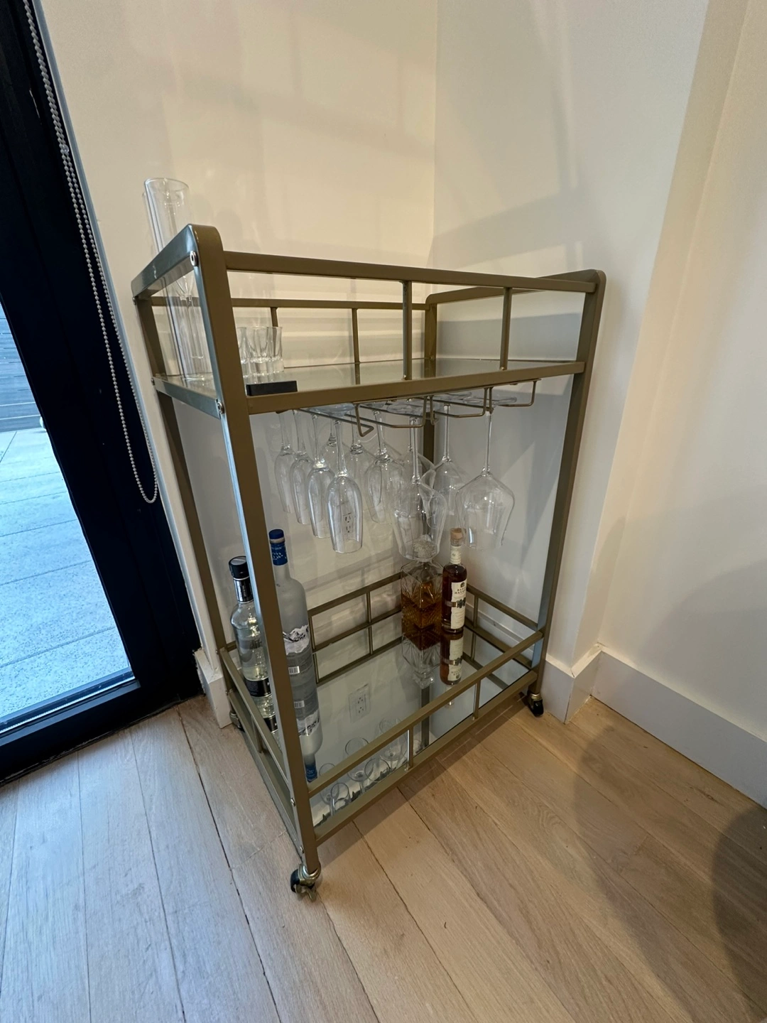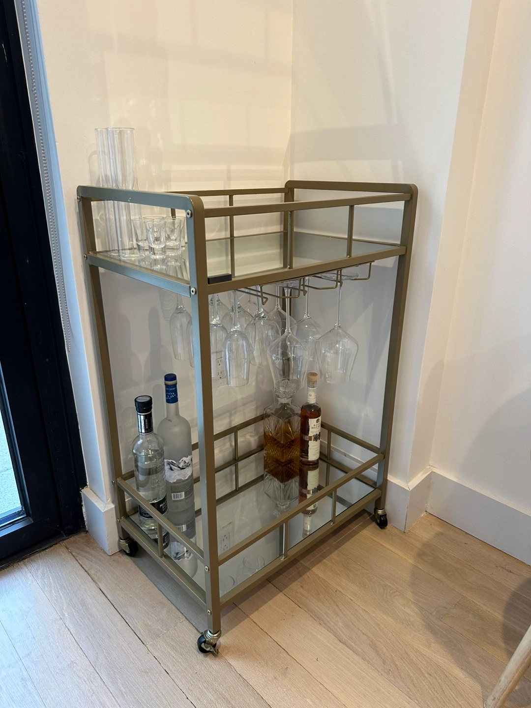 Two-tiered bar cart. Metal frame. Mirrored shelves. Wine glass holders. Rolling casters. Perfect for entertaining.