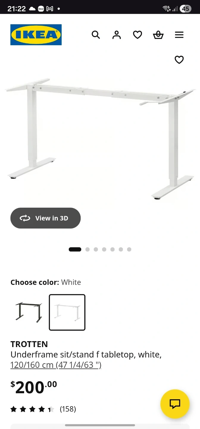 White IKEA TROTTEN sit/stand underframe for tabletops. It's adjustable for tabletops measuring 120/160 cm. Includes all necessary screws for assembly.