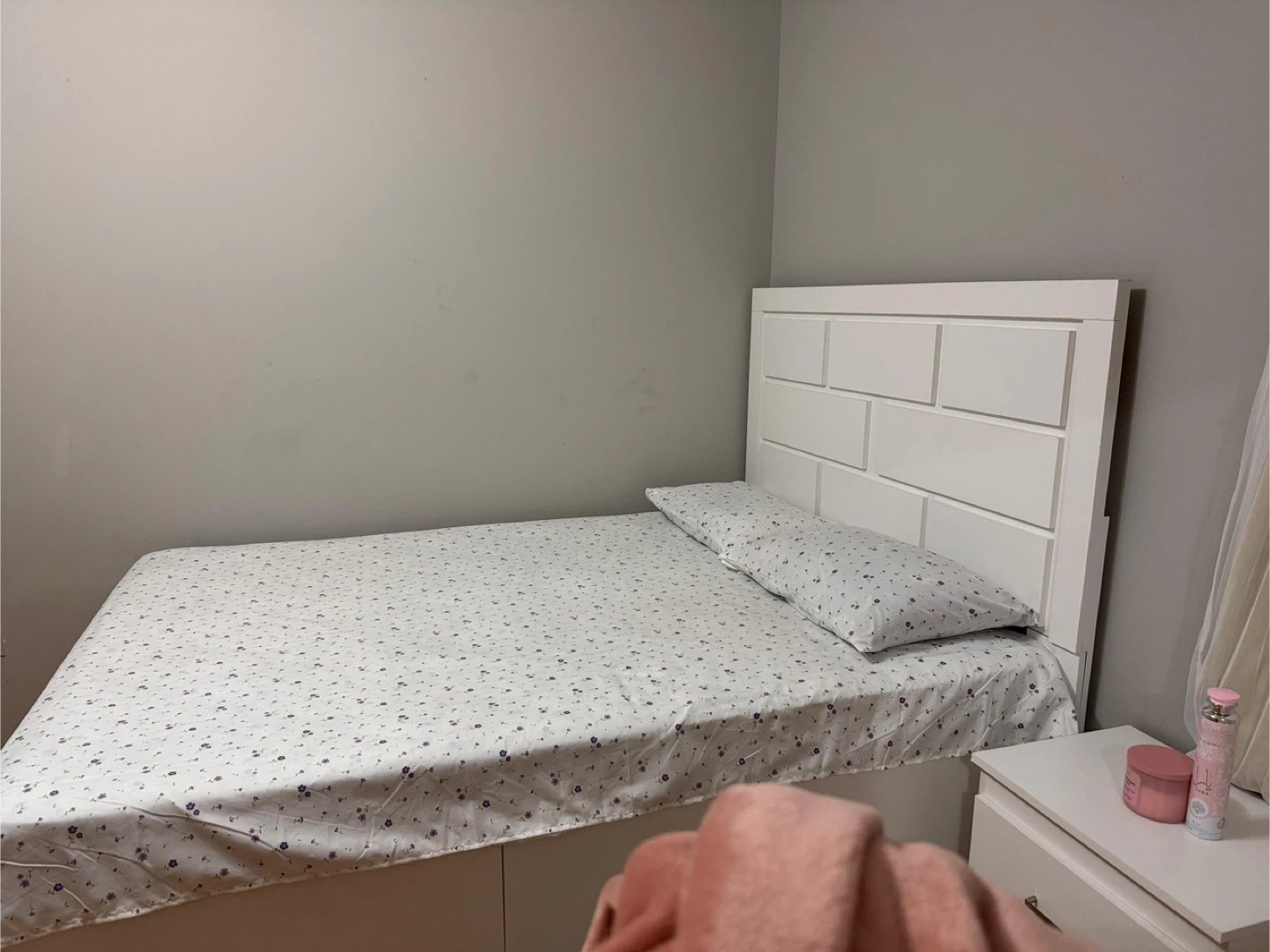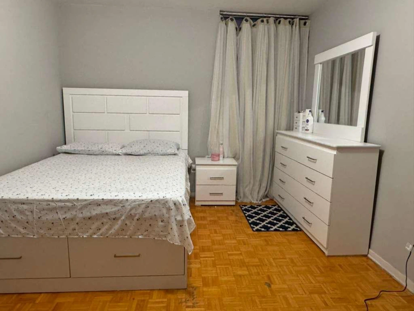 This is a Bedroom set with white dresser with six drawers and an attached mirror. It's made of particle board or MDF. It offers ample storage space for clothing and accessories. This dresser would be useful in a bedroom or dressing area. Used only 4-5 months, receipt available.