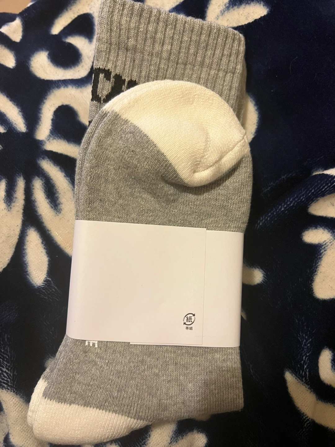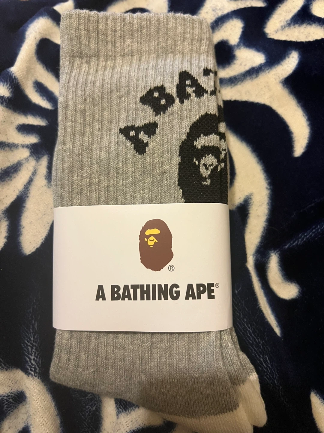 Gray crew socks from A Bathing Ape. Features the brand's iconic ape head logo and "A Bathing Ape" text. Made from a comfortable fabric blend.