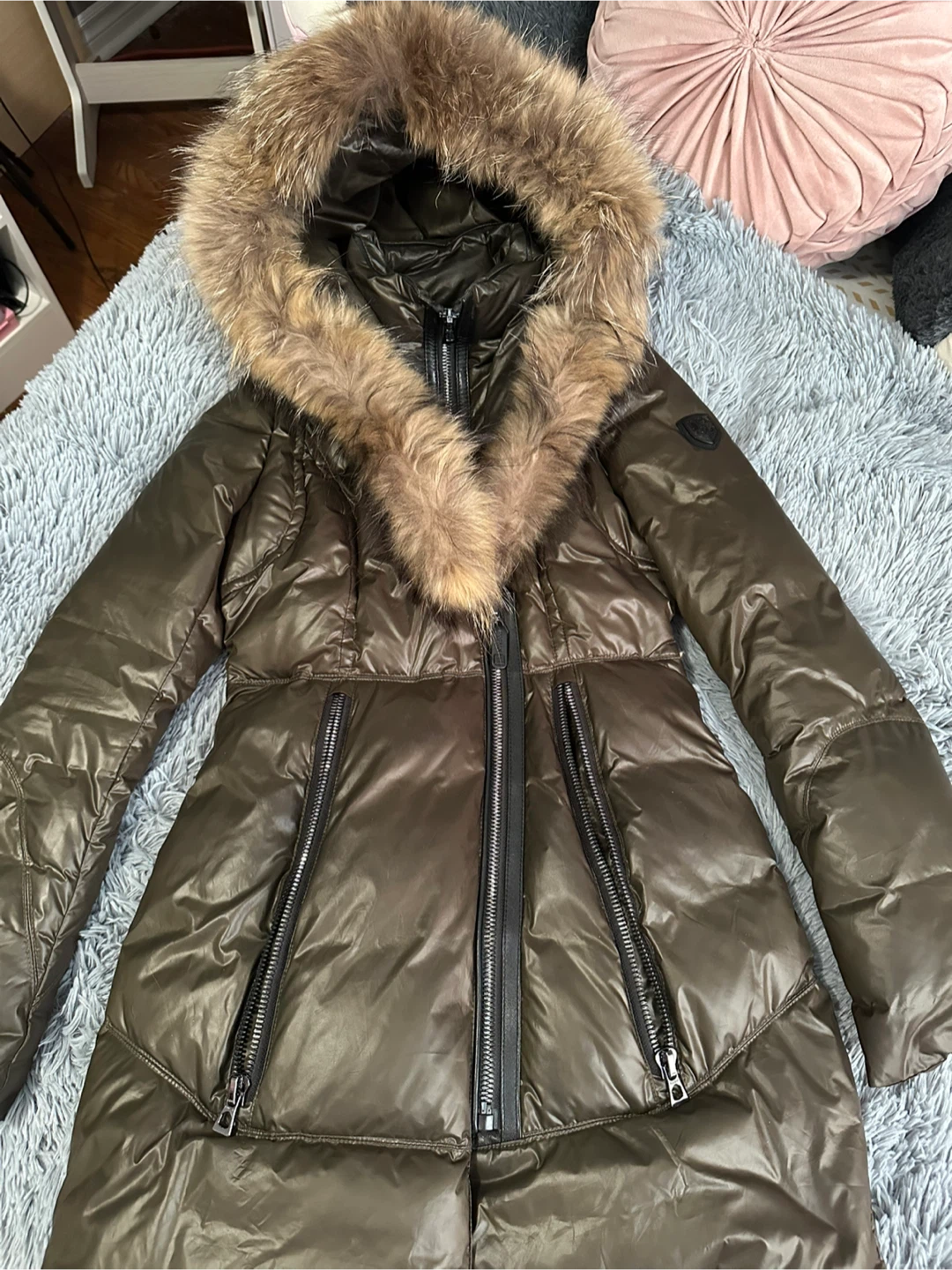 This is a Rudsak down puffer coat in a rich army green colour. It features a luxurious fur-trimmed hood and multiple zippered pockets. Stay warm and stylish this winter!