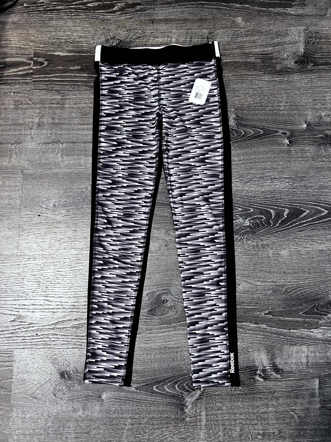 These Reebok leggings feature a black and white abstract print with solid black side panels. They're made for active wear and have a comfortable, stretchy fit. Perfect for running or gym workouts! Size XL (16) from smoke free home. Please check my other posts.