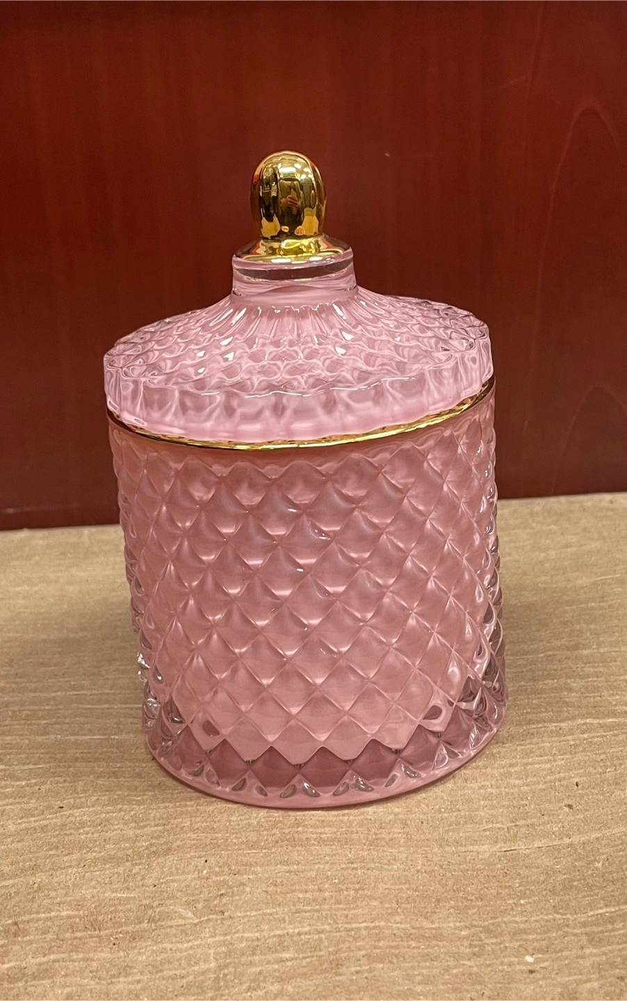 This pink candy jar is made of glass with a diamond faceted design. It features a crystal lid with a gold accent. BPA and lead-free.