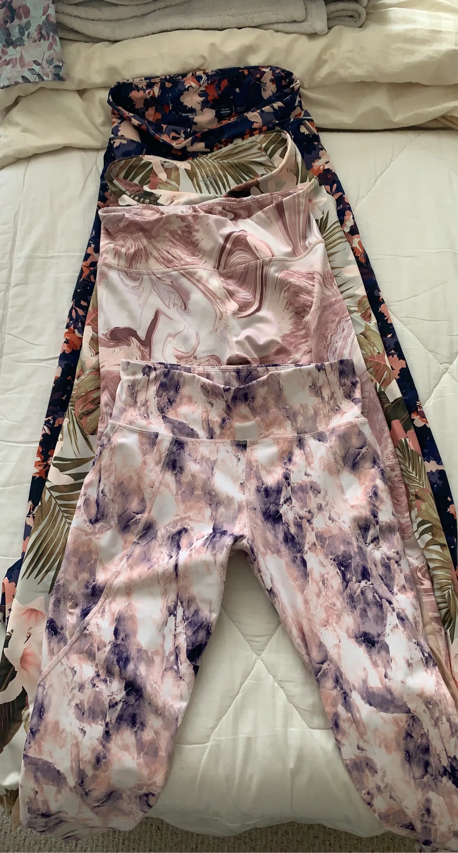 4 pairs of Old Navy leggings, featuring floral and marble-inspired prints. They're made from a stretchy, comfortable fabric. Great for workouts or casual wear! Size Kids XL, comparable to Womens XS or XXS. Never used