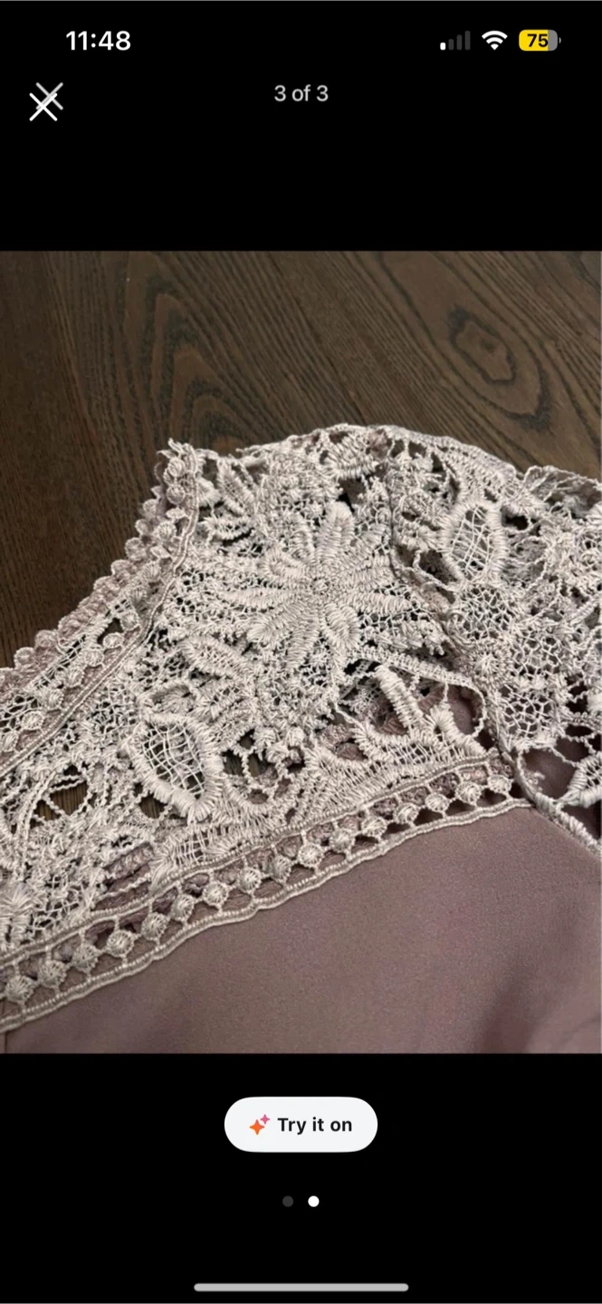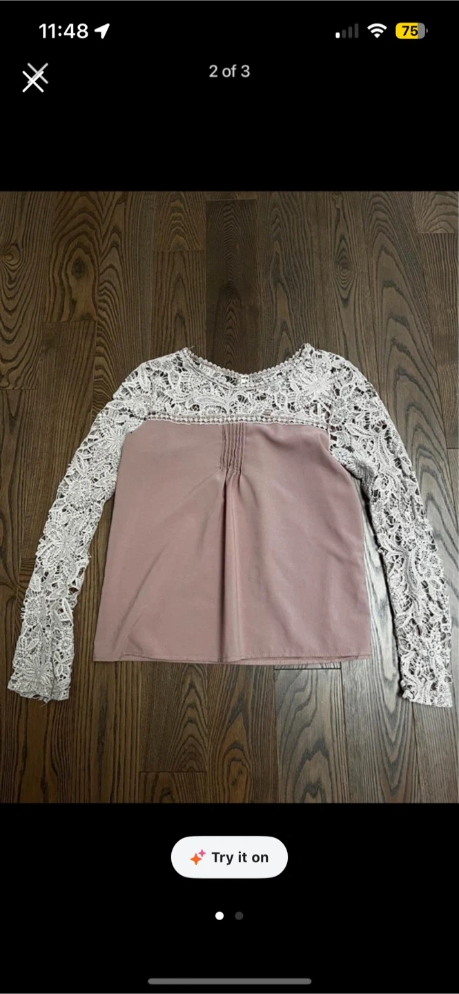 This elegant top features a mauve-toned bodice with subtle pleating detail. It has delicate white lace long sleeves and a lace-trimmed neckline. It's a stylish piece for various occasions.