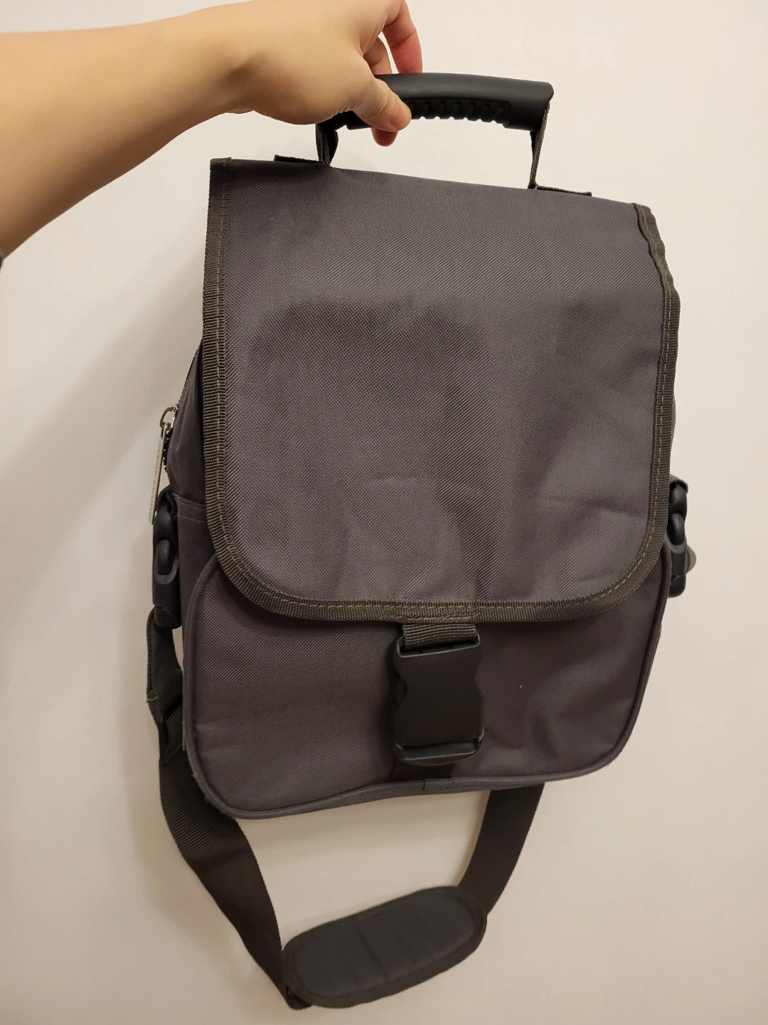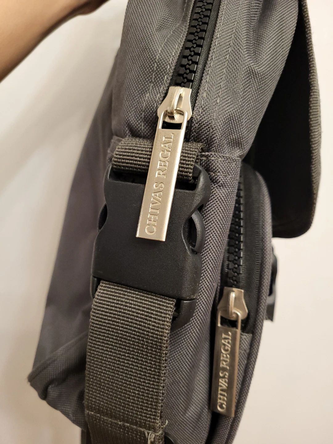 Chivas Regal messenger bag in a charcoal grey colour. It has a flap closure with a buckle and multiple zippered compartments. Durable fabric construction.