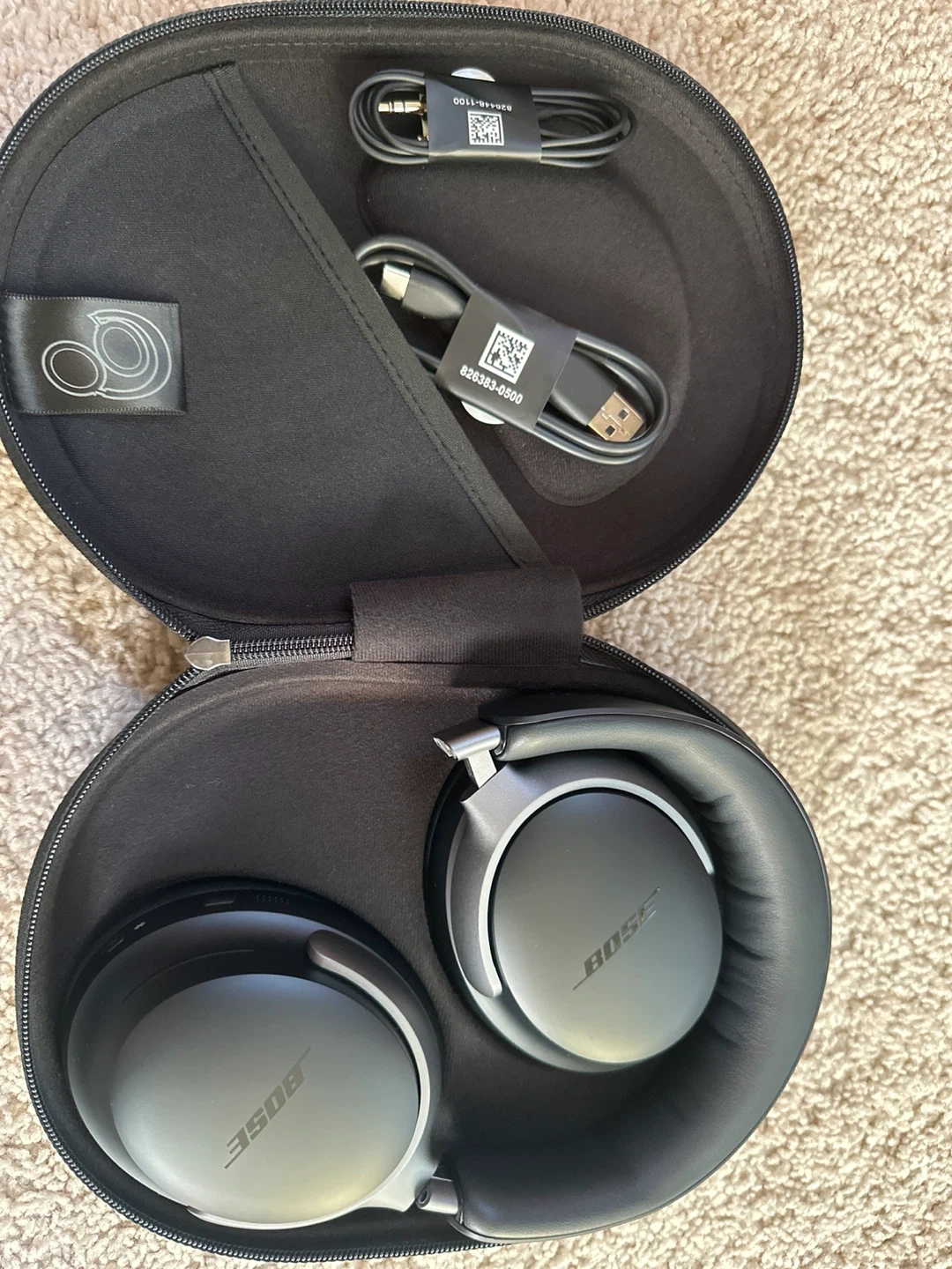 These are Bose noise-cancelling headphones. They come with a protective carrying case, a USB charging cable, and an audio cable. They're black and feature soft earcups for comfort.