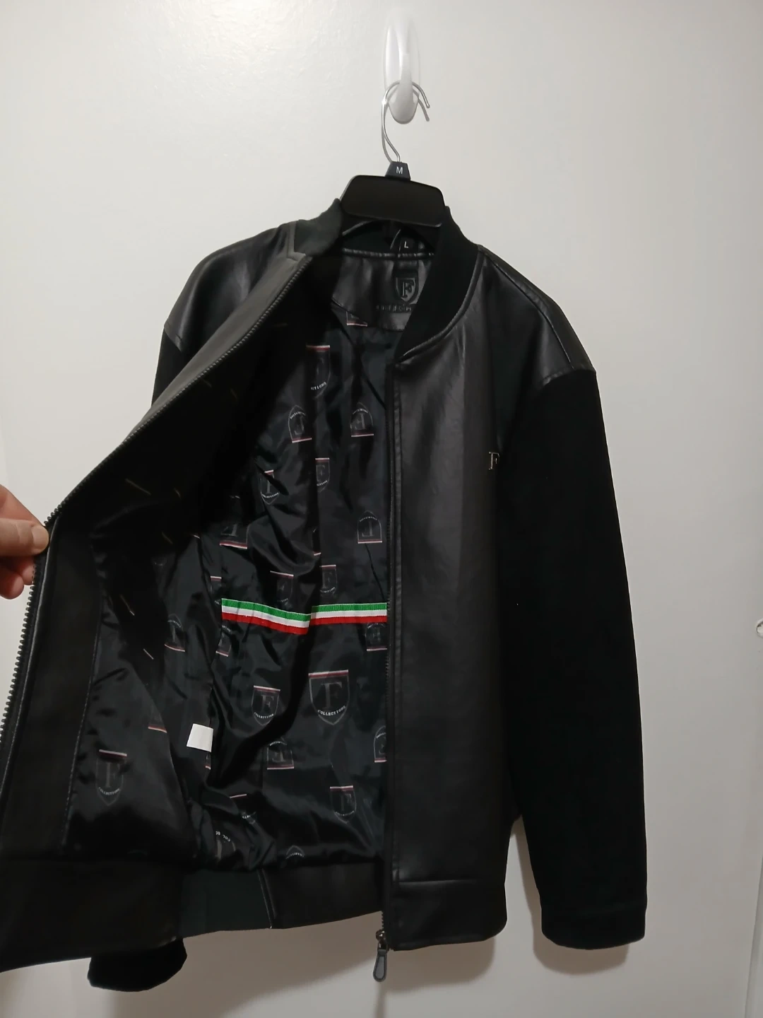 This black bomber jacket features a faux leather front and sleeves with suede side panels. It's lined with a black satin material with a repeating brand logo pattern. Includes a full zip closure and ribbed collar, cuffs, and hem.