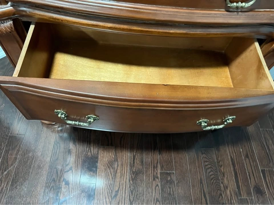 Spacious dark wood dresser with 7 drawers, offering plenty of storage space. Beautiful design with decorative metal handles and carved details. Strong and sturdy piece, perfect for a bedroom or living room. Size: 41” x 65”. Price: $163. Cash or e-transfer accepted.