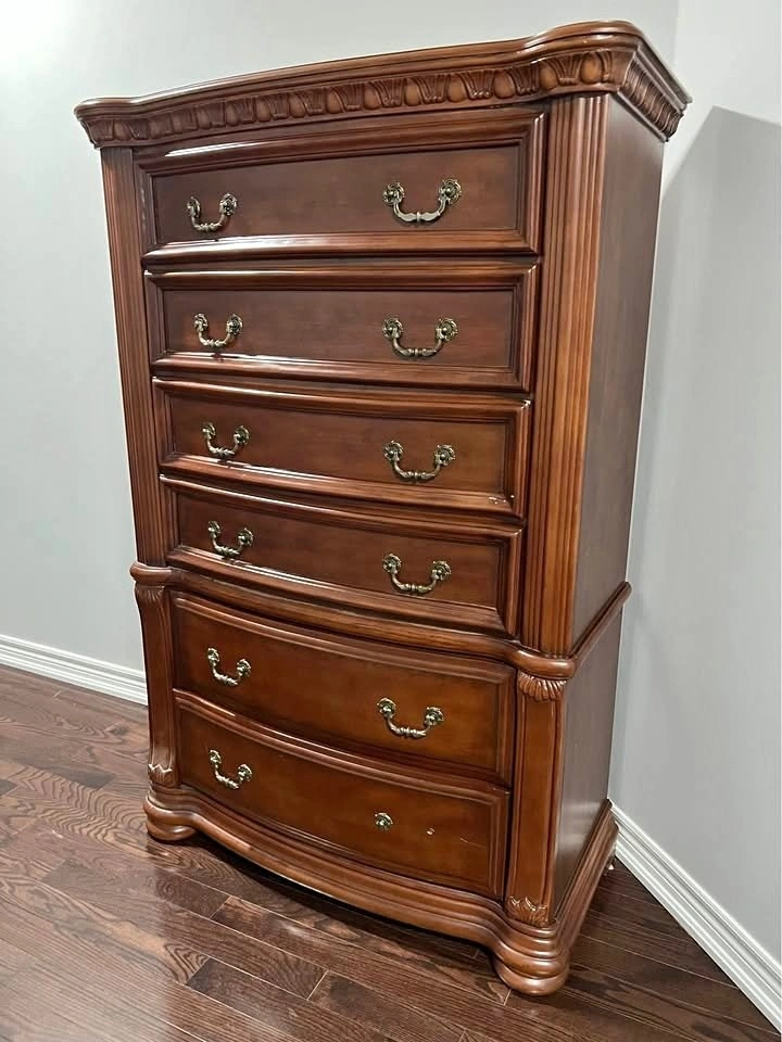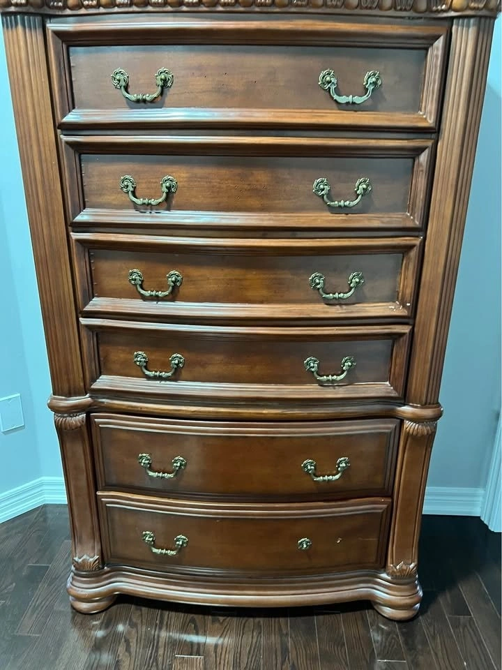 Spacious dark wood dresser with 7 drawers, offering plenty of storage space. Beautiful design with decorative metal handles and carved details. Strong and sturdy piece, perfect for a bedroom or living room. Size: 41” x 65”. Price: $163. Cash or e-transfer accepted.