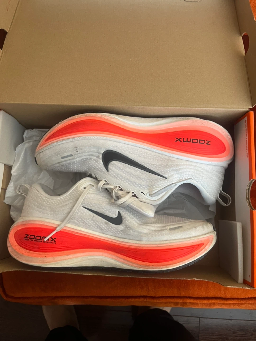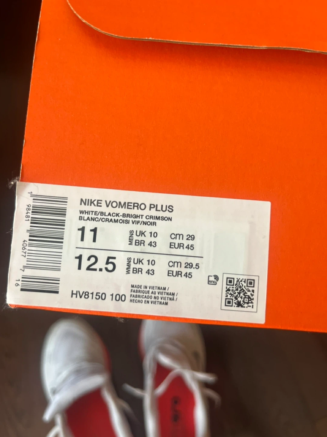 White Nike Vomero Plus running shoes. Men's US size 11, women's US size 12.5. Includes original box. Plenty of life left.