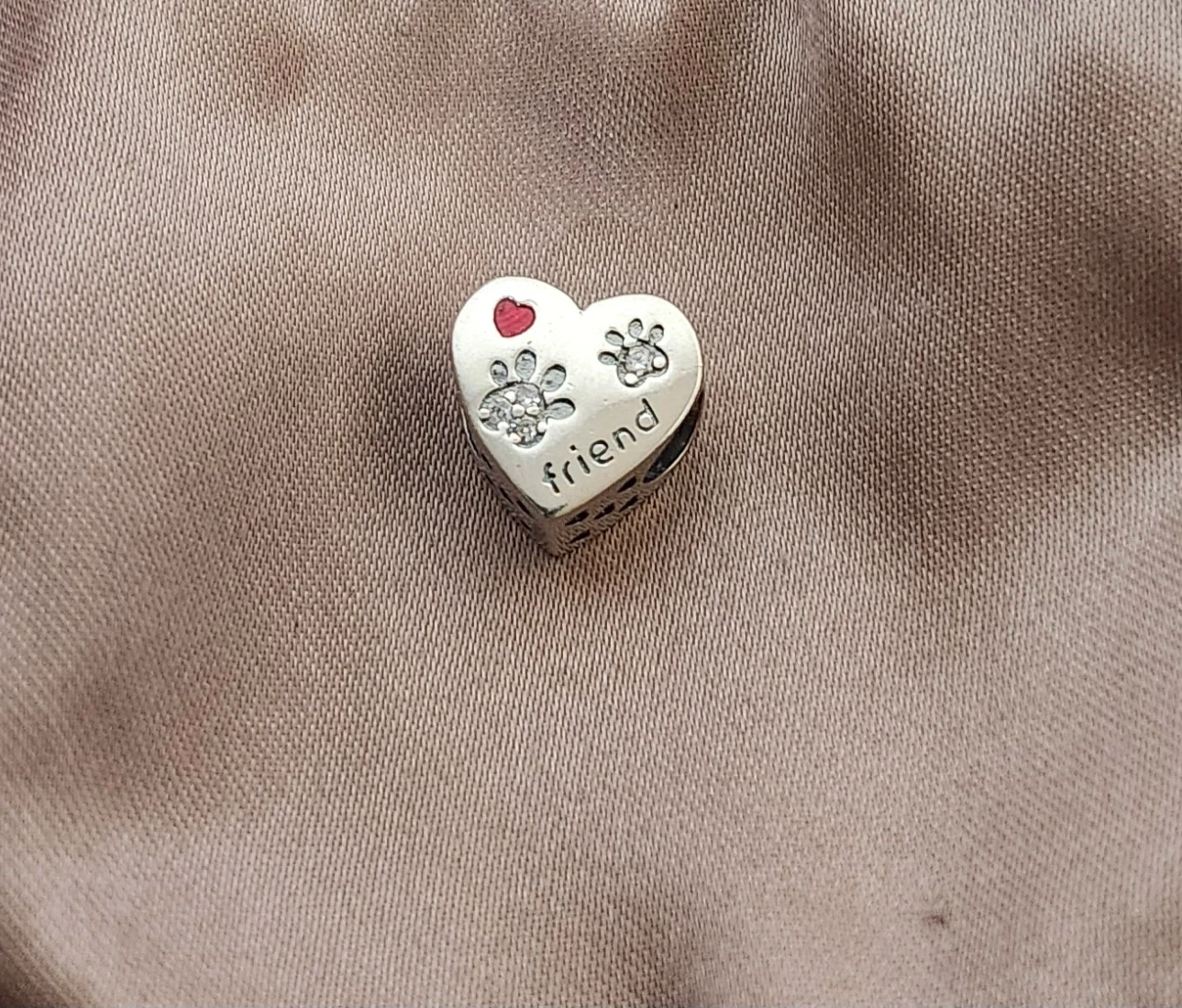This charming heart-shaped bead features paw prints and the word "friend" engraved on it. It has a small red heart accent. It's perfect for a bracelet or necklace to show your love for a pet.
