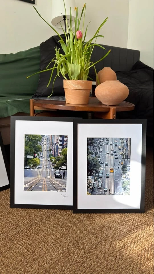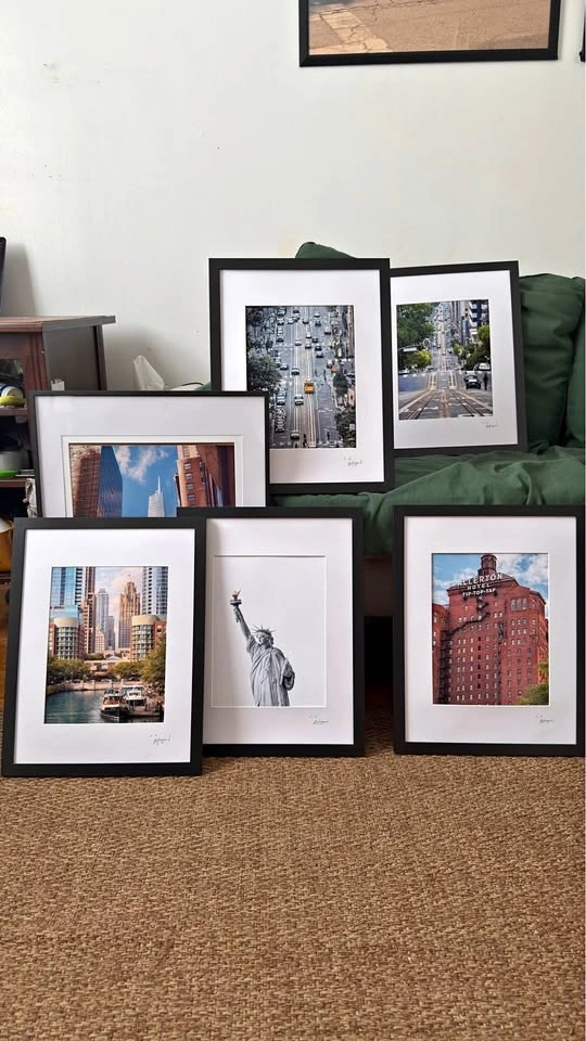Cool framed art prints featuring a mix of city scenes and famous landmarks. Includes prints of the Statue of Liberty, the Allerton Hotel, and street views from San Francisco, Chicago, and New York. All are in black frames with white mats and signed by me, the photographer.