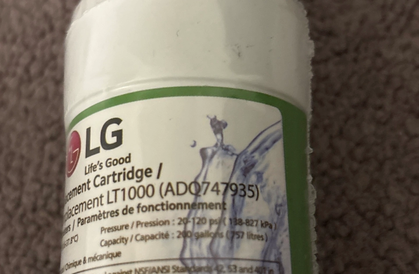 New LG refrigerator water filter cartridge. Model LT1000, part number ADQ747935. Filters 200 gallons of water. Pressure 20-120 psi.