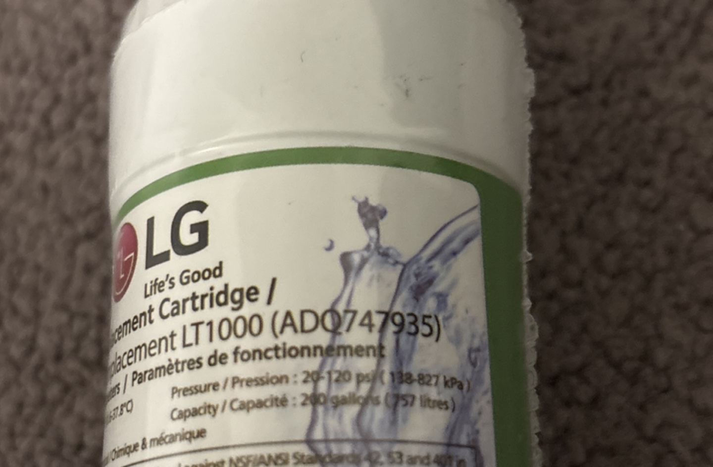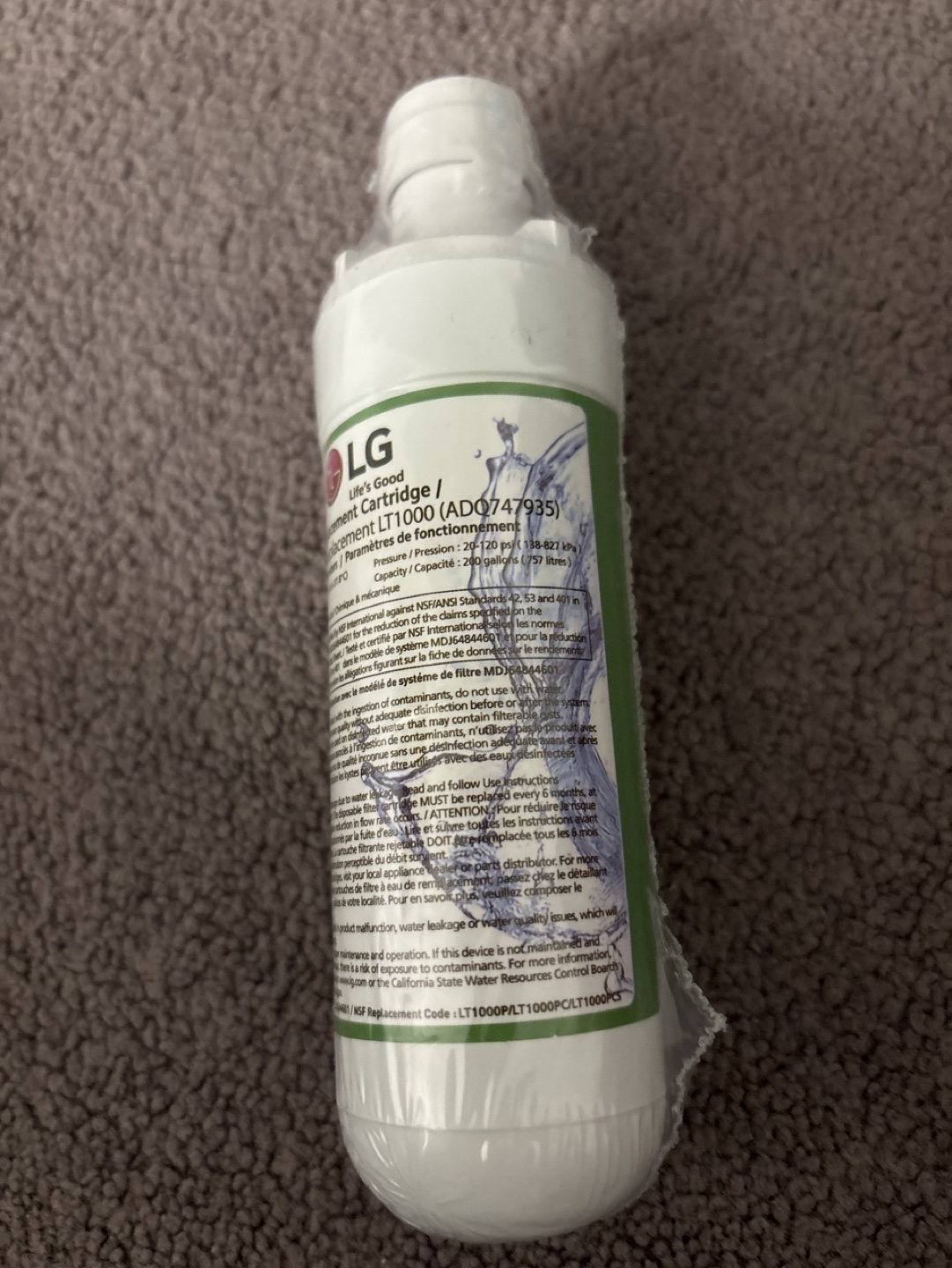 New LG refrigerator water filter cartridge. Model LT1000, part number ADQ747935. Filters 200 gallons of water. Pressure 20-120 psi.