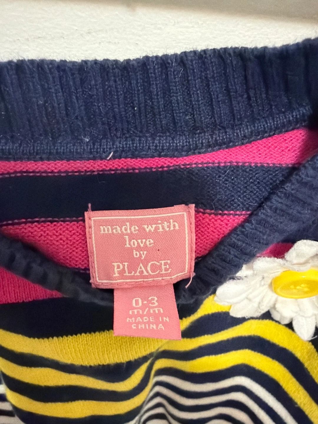This adorable sweater features a colourful striped pattern with a cute daisy applique on the front. It's made from 100% cotton for comfort. Size is 0-3 months.