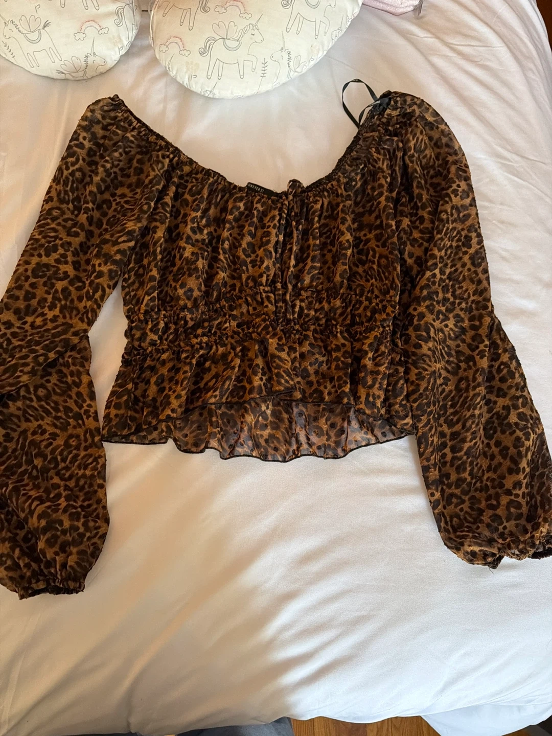 This is a sheer, leopard print long sleeve top from Forever 21. It features a cinched waist and a ruffled hemline. The sleeves are puffy with elastic cuffs. It's a stylish piece for layering!