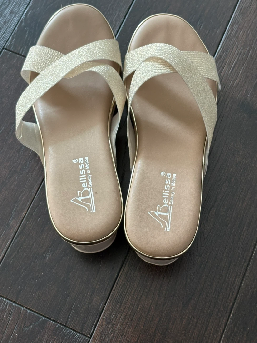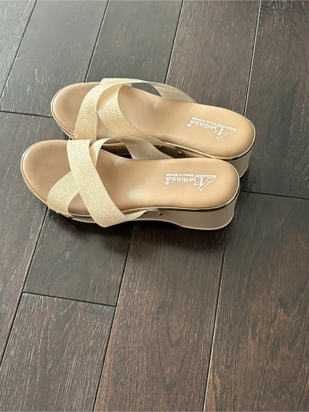 Bellissa women's sandals with a shimmering gold glitter criss-cross strap design. They feature a comfortable wedge heel and a gold trim. These sandals are a stylish choice for warm weather outings!