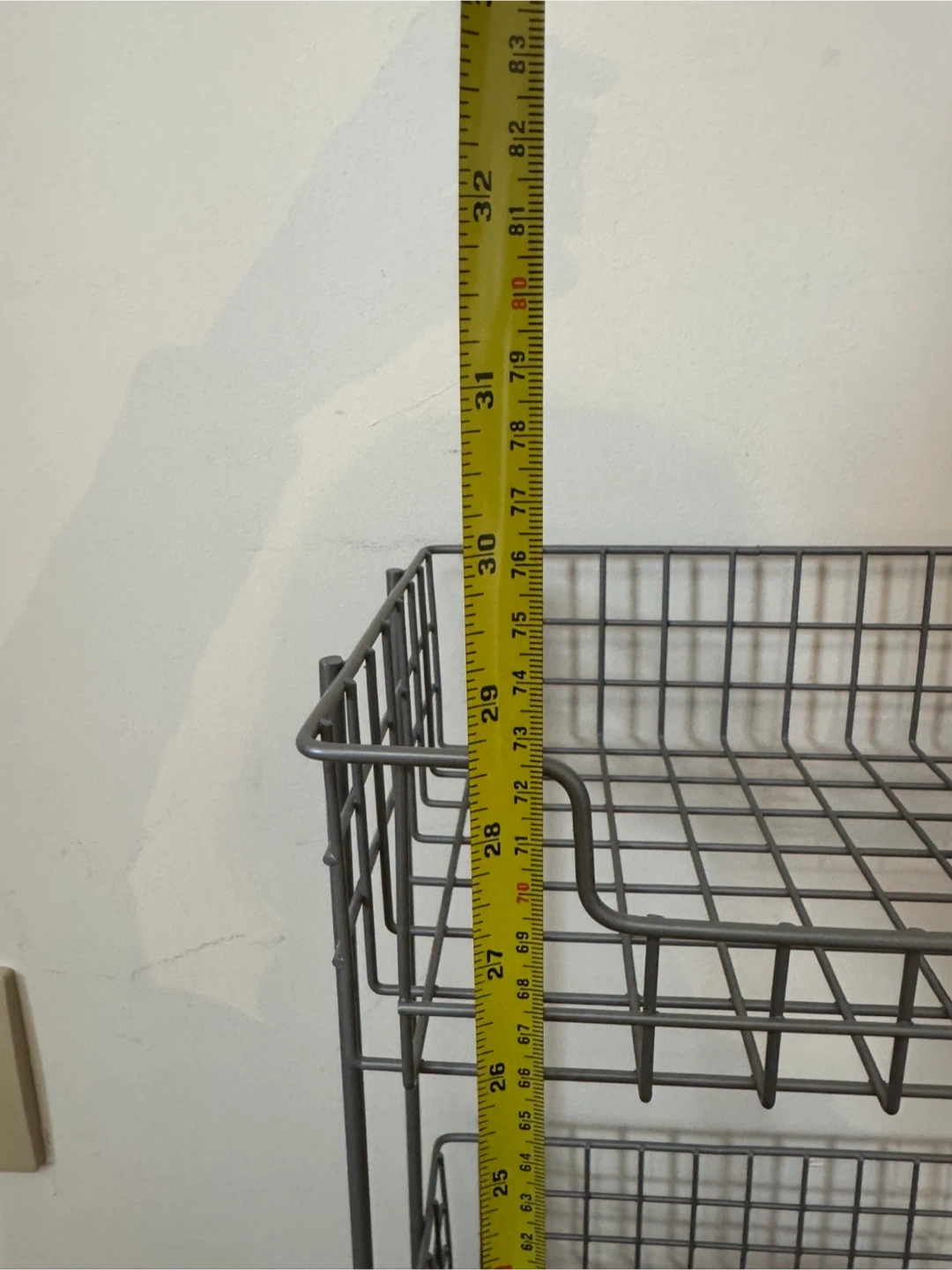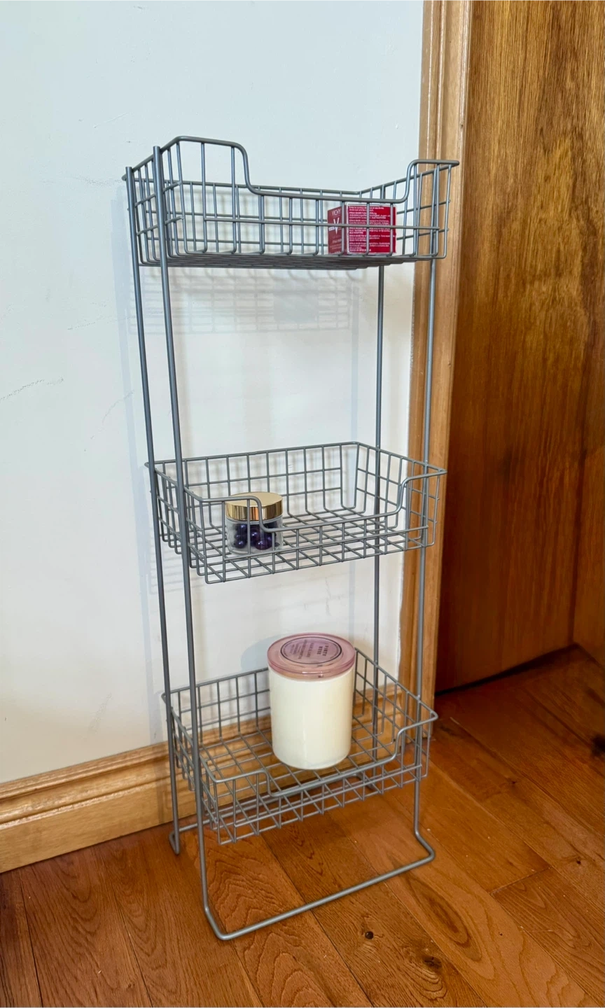 This grey metal wire shelving unit has three baskets for storage. It's great for organizing toiletries, pantry items, or craft supplies. The unit measures approximately 29 inches tall.