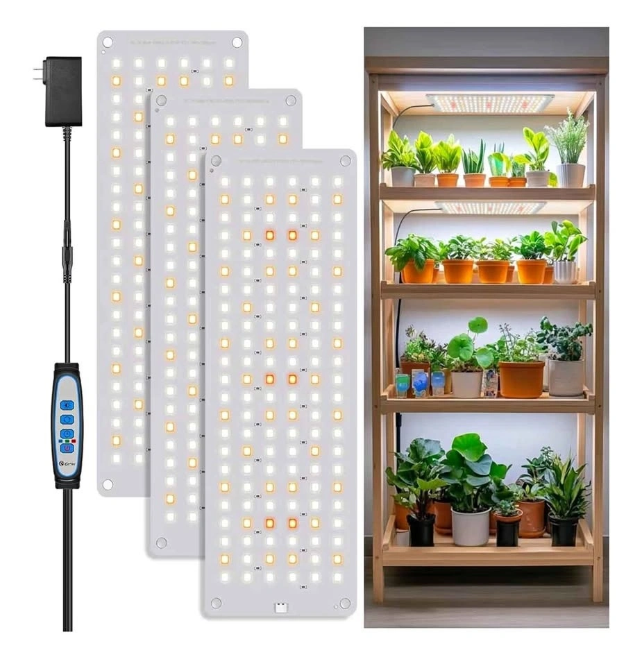 Full Spectrum, 3 panels, Adaptor, 16 Hour Timer, Warm/Cold/Neutral light. I’m selling my grow light panels because I upgraded to more powerful ones. These panels are very good and provide strong light at a distance of about 10–15 cm. The farther away they are, the less intense the light, depending on how much light your plant needs. There are no visible damages, and they work perfectly. I also have a set of 4 available if you’re interested. I can offer a discount if you buy all of them.