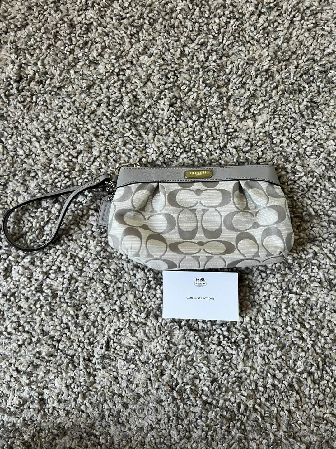 This Coach wristlet is in great condition! It features a stylish grey and white pattern. Perfect for carrying your essentials in a compact and fashionable way