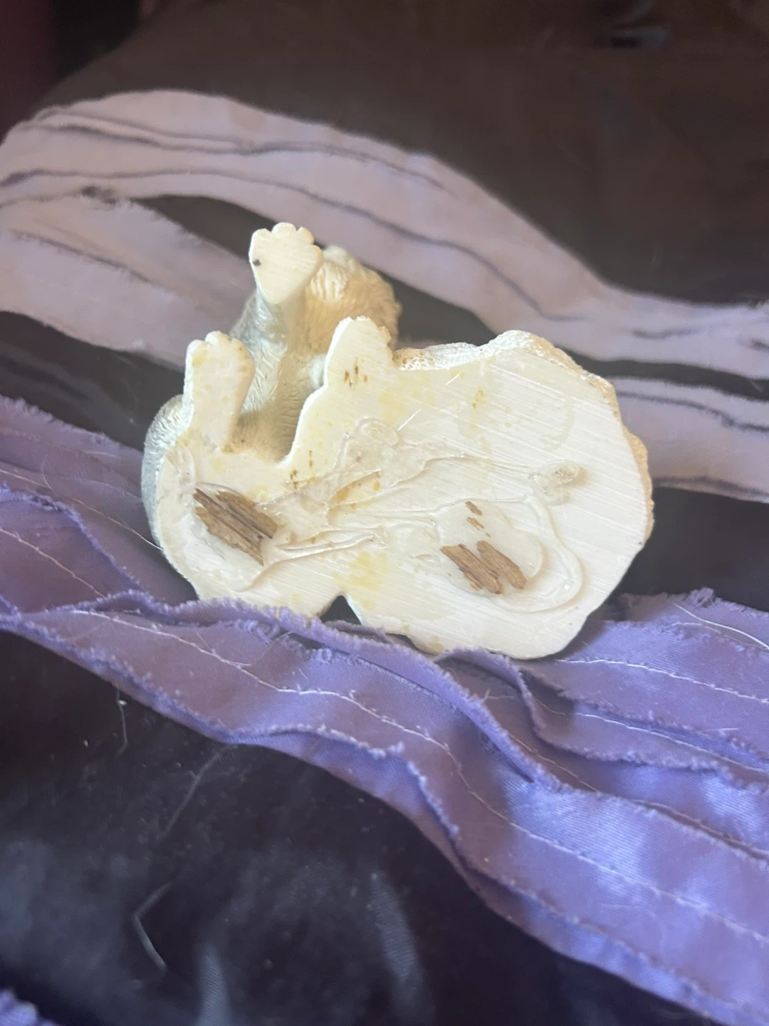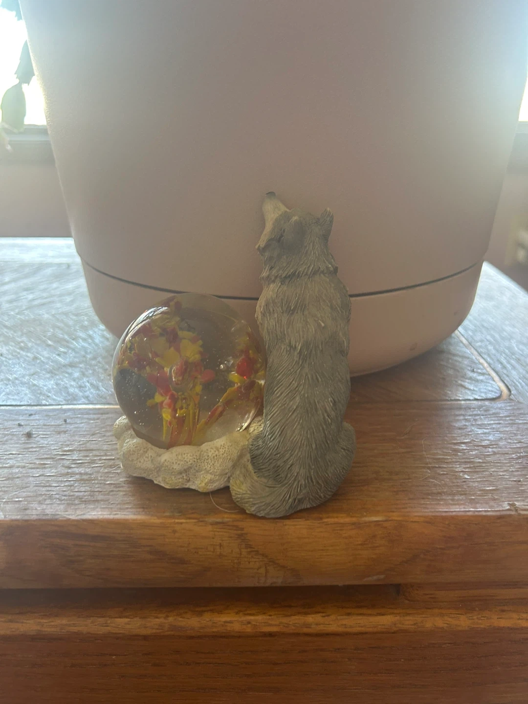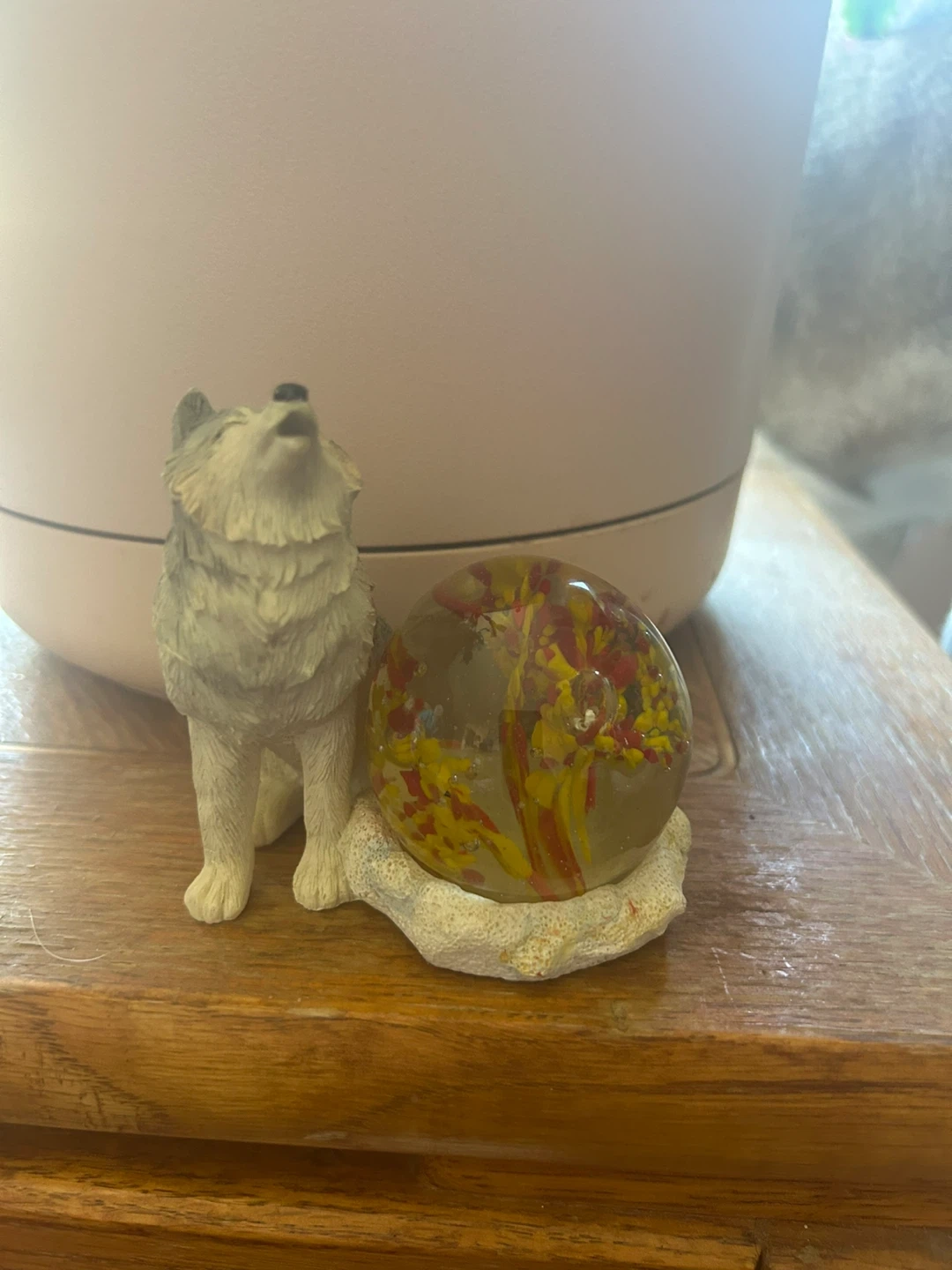 Wolf figurine with a colourful paperweight on a base. This decorative piece features a grey wolf howling beside a glass orb with red and yellow swirls.