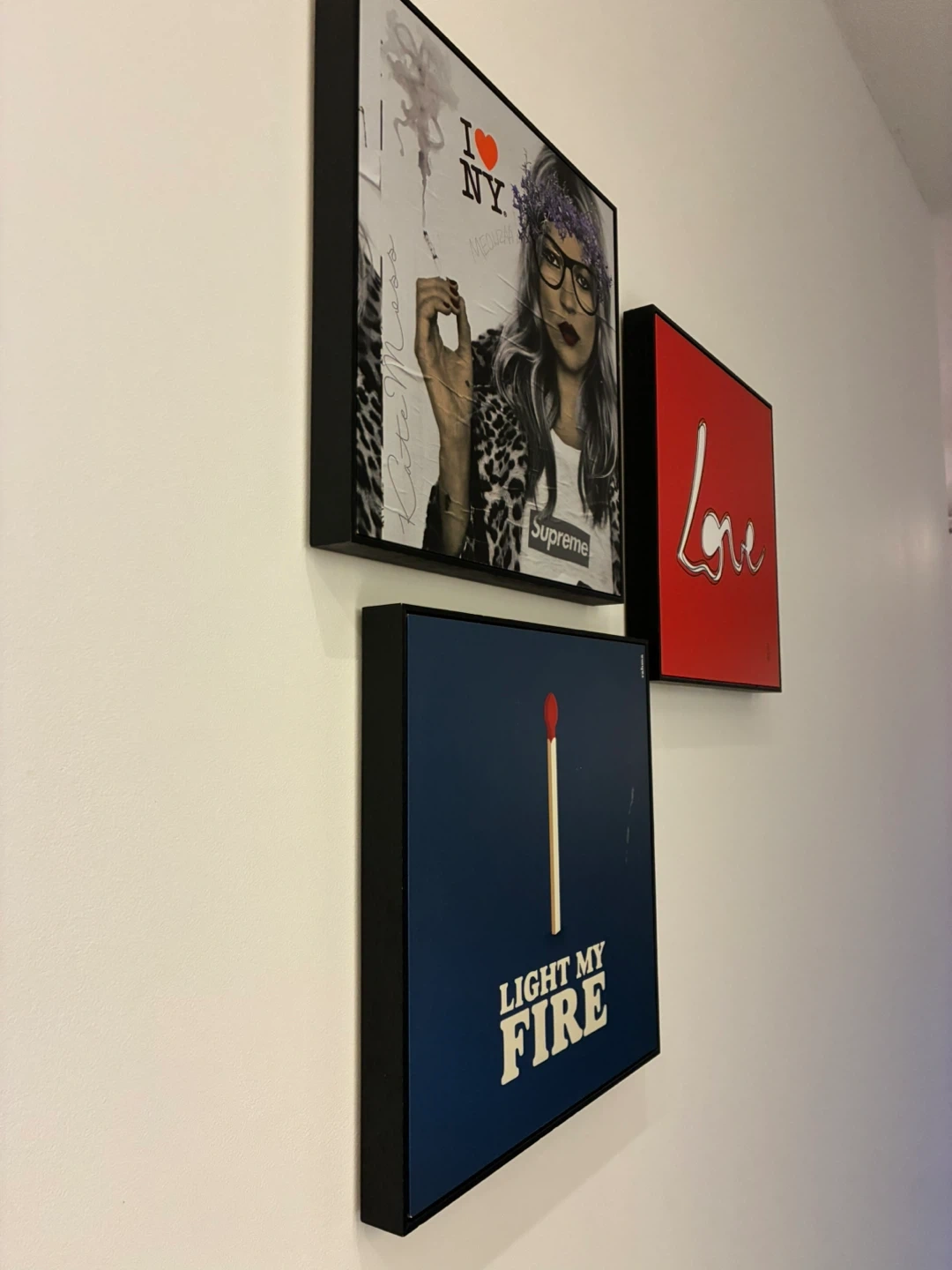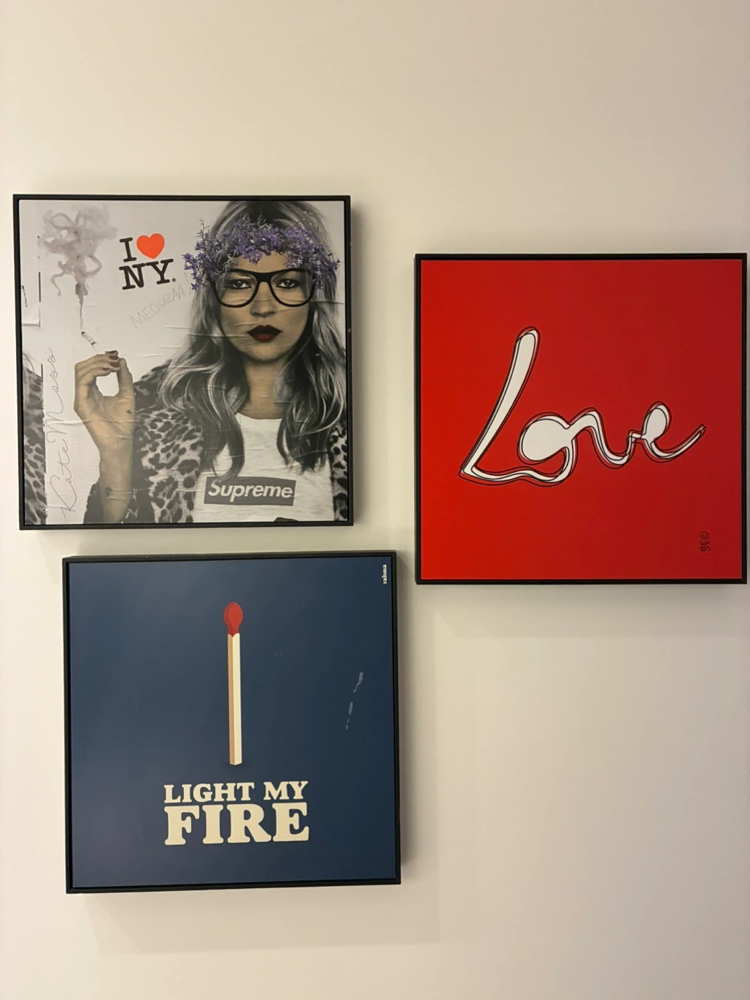 This set includes three framed art prints. One features a 'Supreme' graphic with 'I ❤️ NY' text. Another has a large red 'Love' script. The third print depicts a matchstick with 'Light My Fire' text. It's a unique collection for home decor!