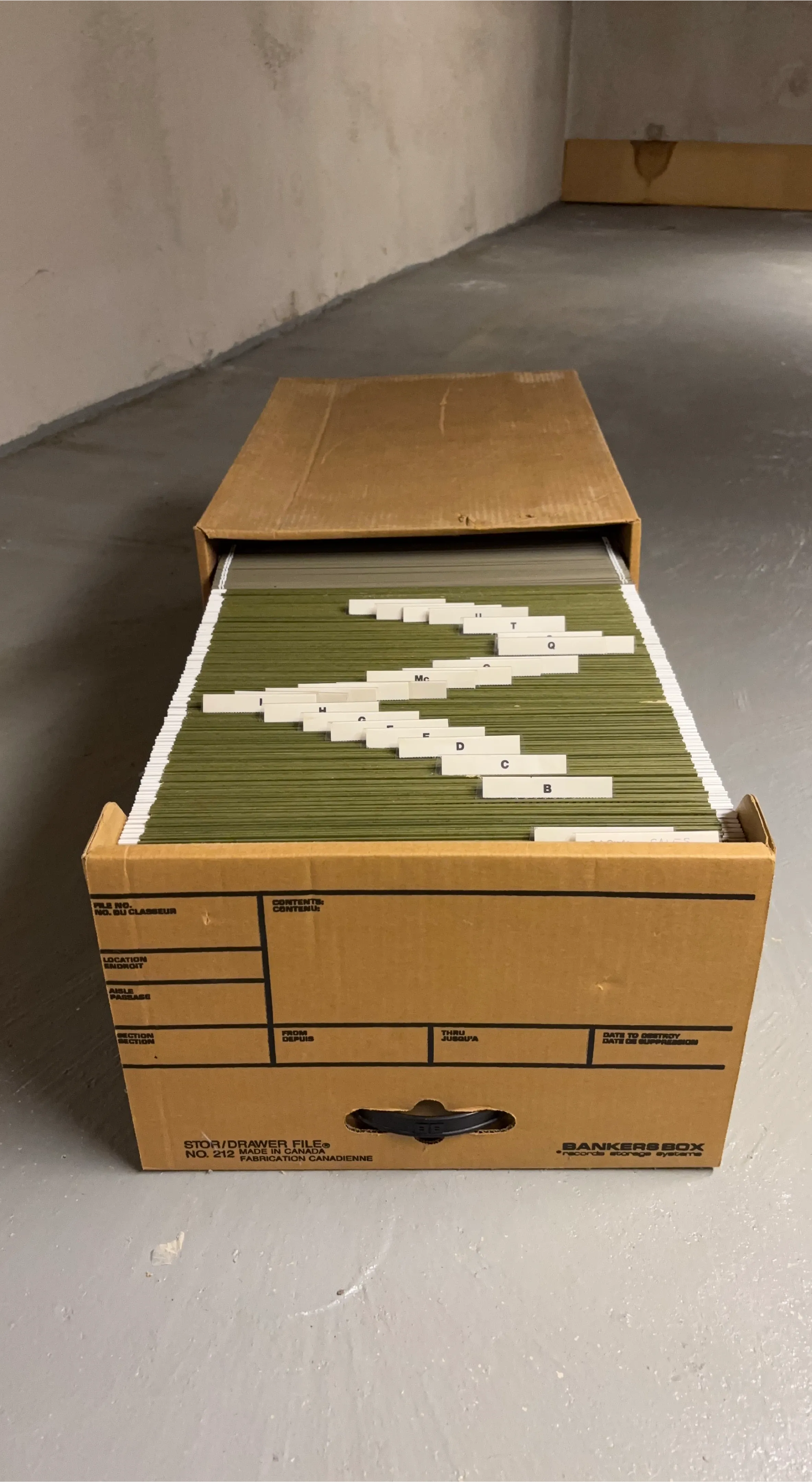 This Legal Size Bankers Box Storage/Drawer File 212 is made in Canada and comes with green hanging file folders. It's a convenient solution for organizing documents. The box includes labels for categorization. I have qty. 2.