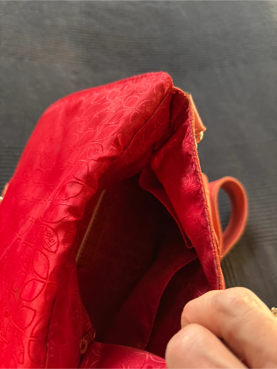 This is a red leather Fossil crossbody bag with a zippered main compartment and an exterior pocket. It has an adjustable strap and a patterned fabric interior with multiple pockets. A great everyday bag!