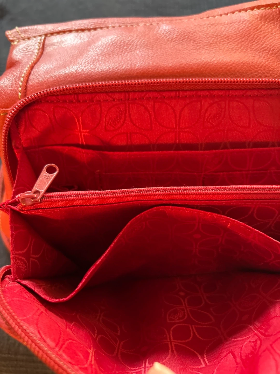 This is a red leather Fossil crossbody bag with a zippered main compartment and an exterior pocket. It has an adjustable strap and a patterned fabric interior with multiple pockets. A great everyday bag!