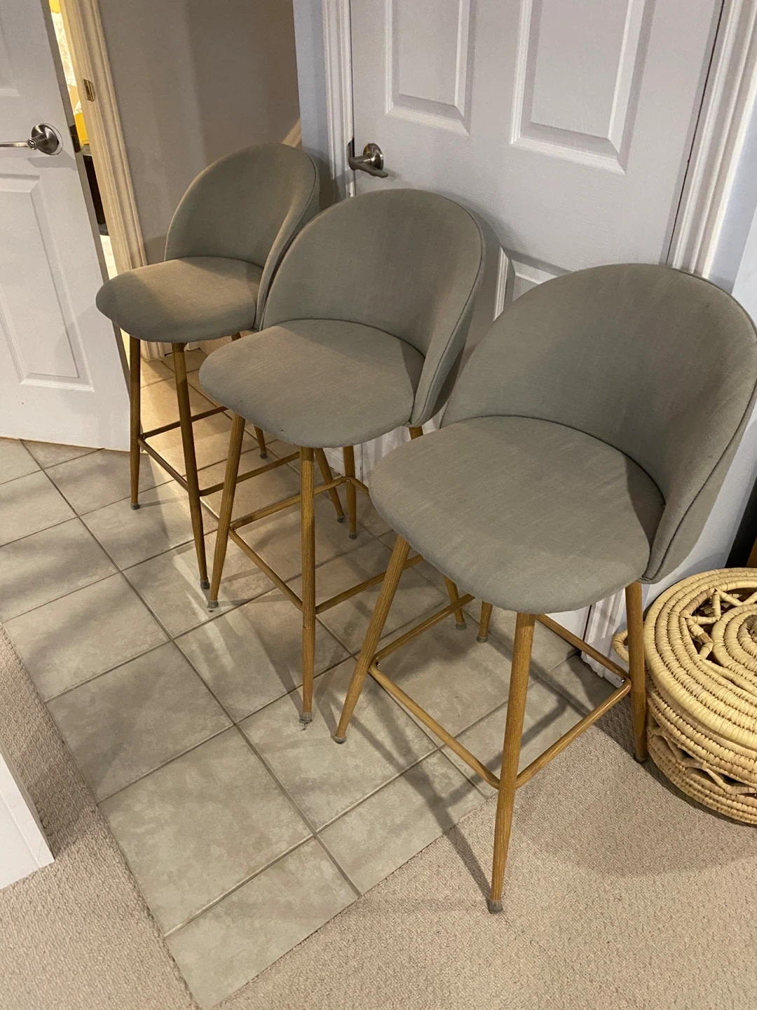 $60-Selling a set of three bar stools, perfect for adding a touch of modern style to your kitchen or bar area. They feature a comfortable curved back and a neutral grey upholstery. Base is not wood and a 200lbs weight capacity.