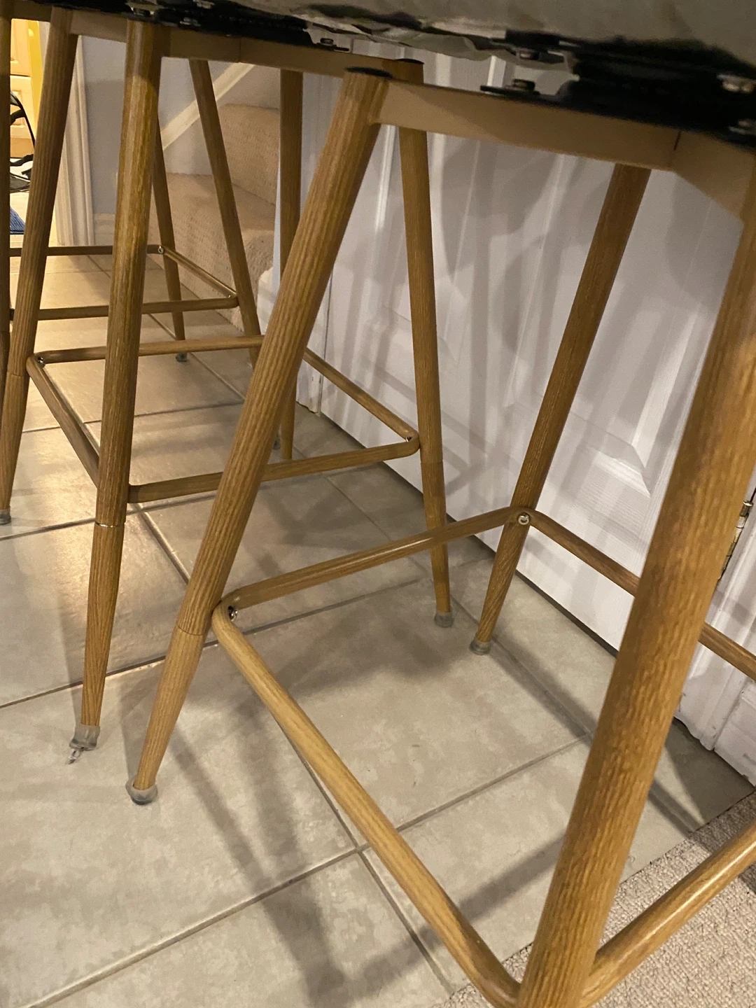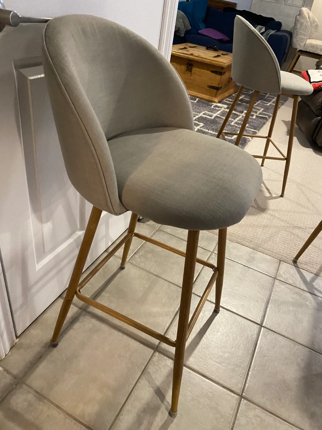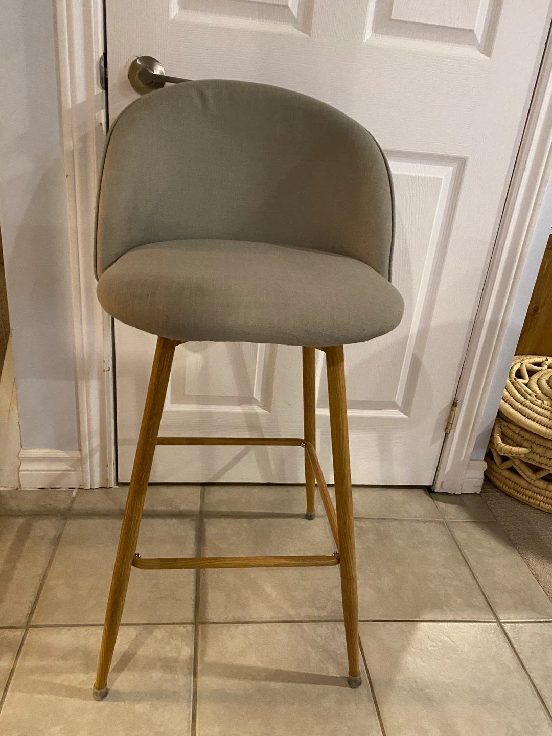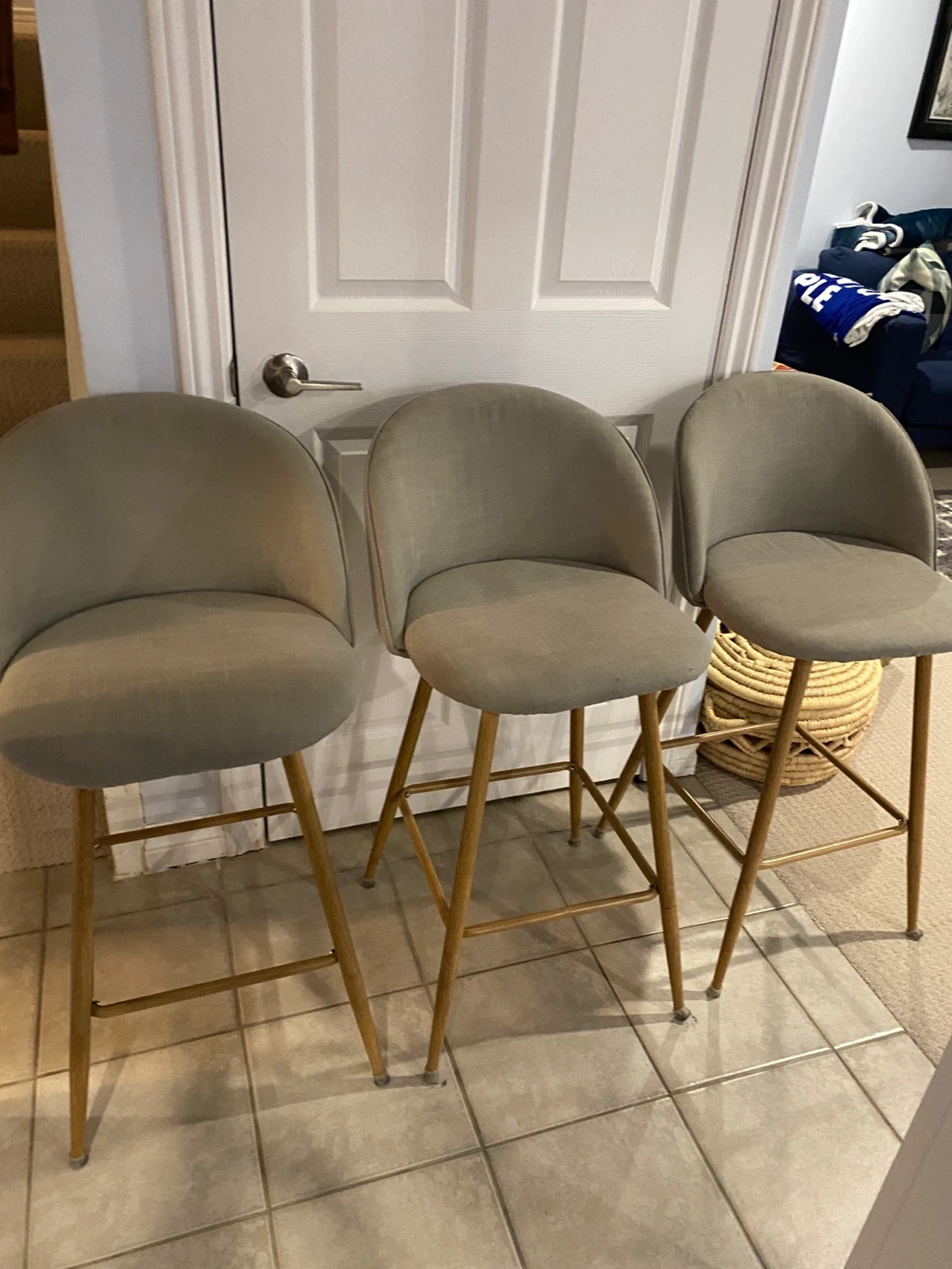$60-Selling a set of three bar stools, perfect for adding a touch of modern style to your kitchen or bar area. They feature a comfortable curved back and a neutral grey upholstery. Base is not wood and a 200lbs weight capacity.