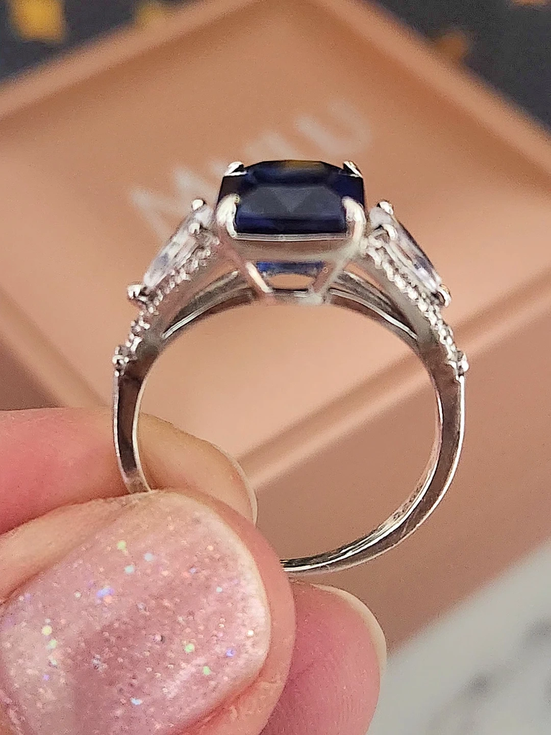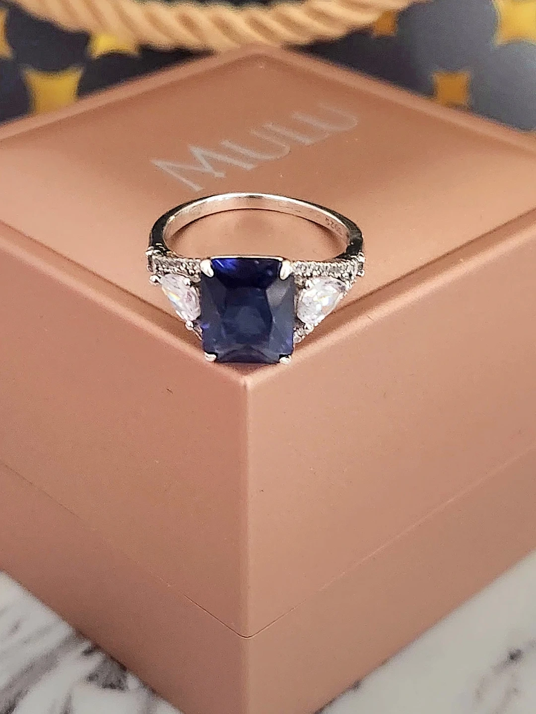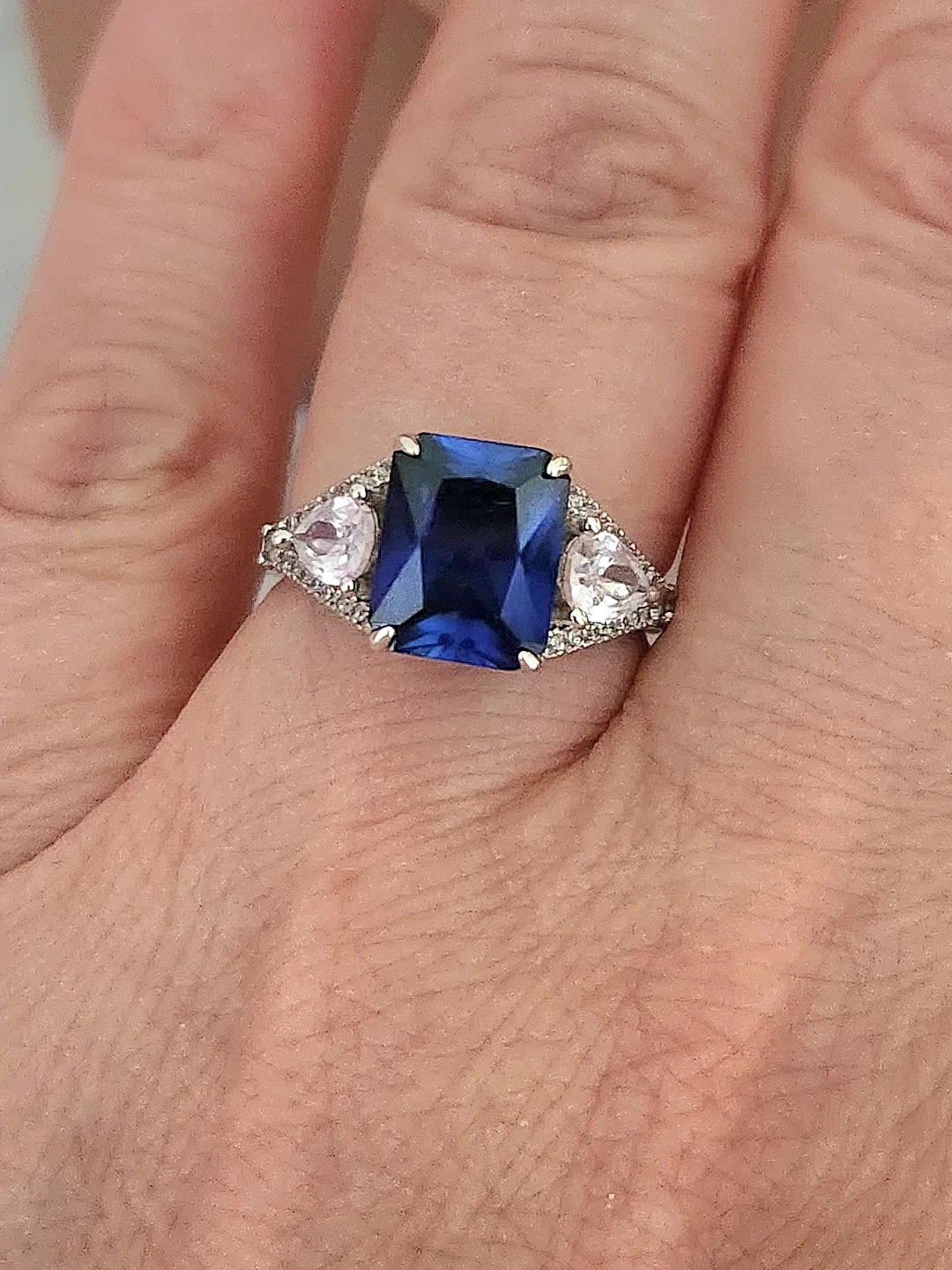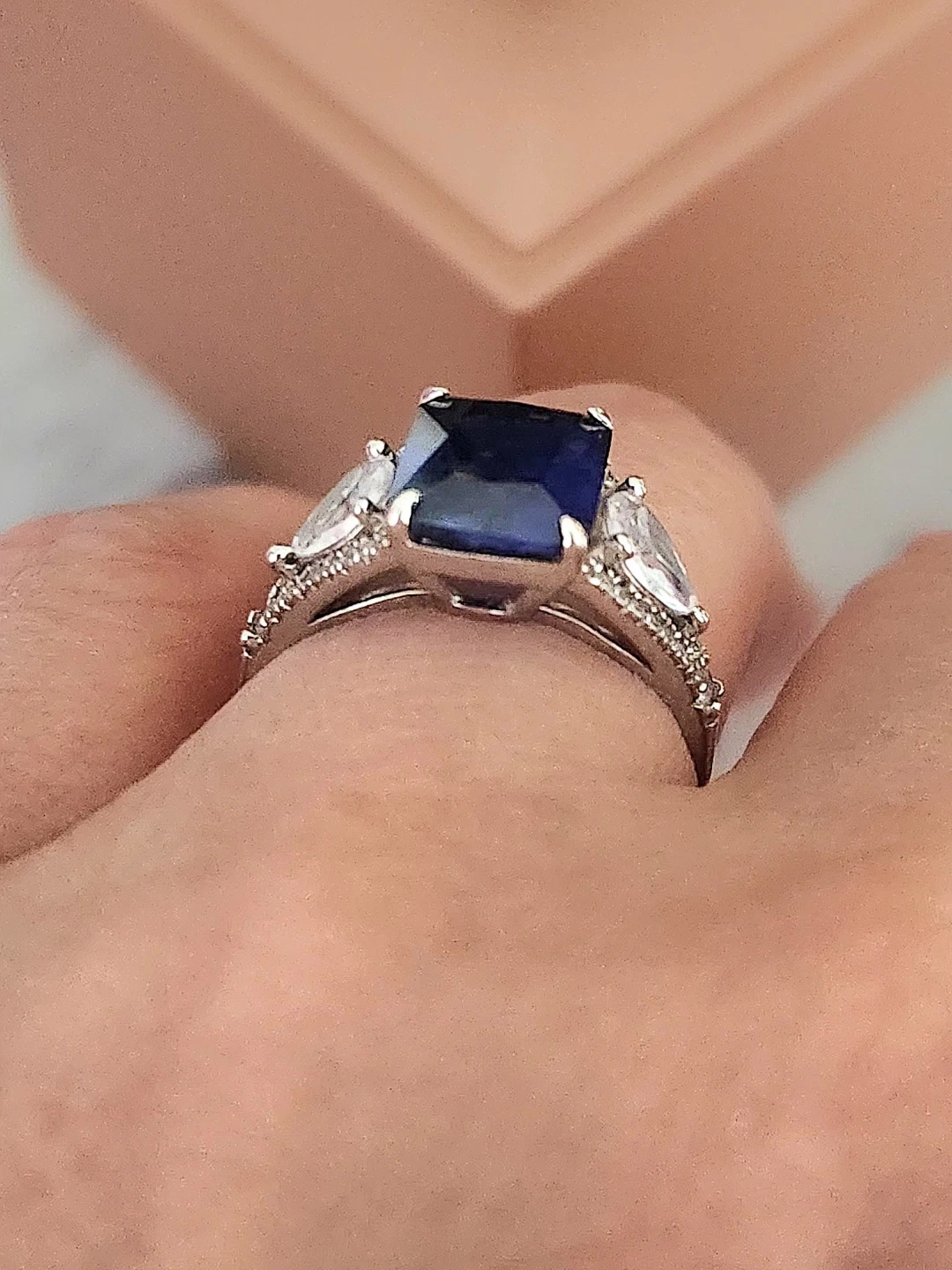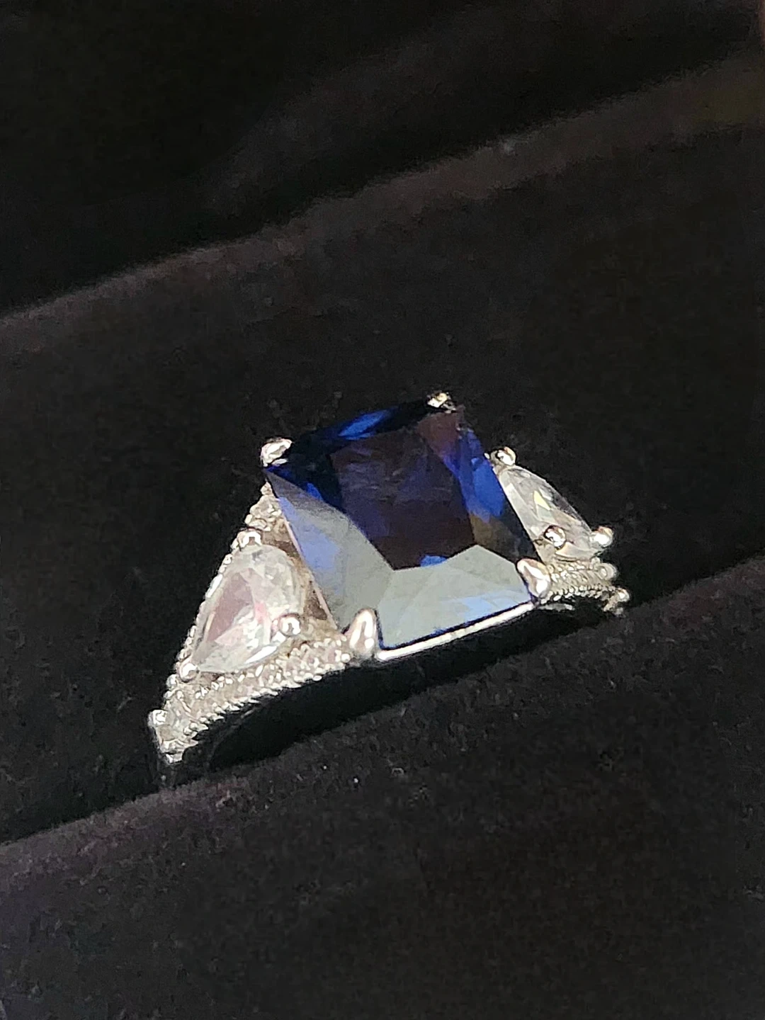 This elegant ring features a stunning emerald-cut blue gemstone sapphire centre, accented by pear-shaped stones and small diamond details along the band. Crafted with quality materials for a beautiful shine. A lovely statement piece! Purchased for around $300 and worn only twice, so it's in like-new condition, perfect for gifting. Comes with original gift bag and a lighted ring box. Asking $200obo.