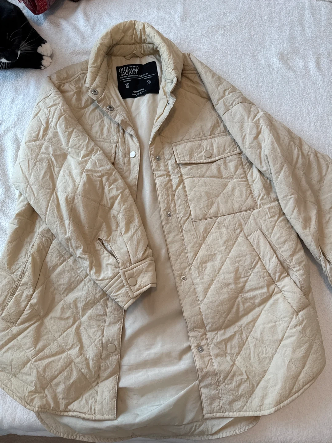 A beige quilted jacket with a collared neckline. It features button closures and chest pockets. This jacket is suitable for layering in cooler weather.