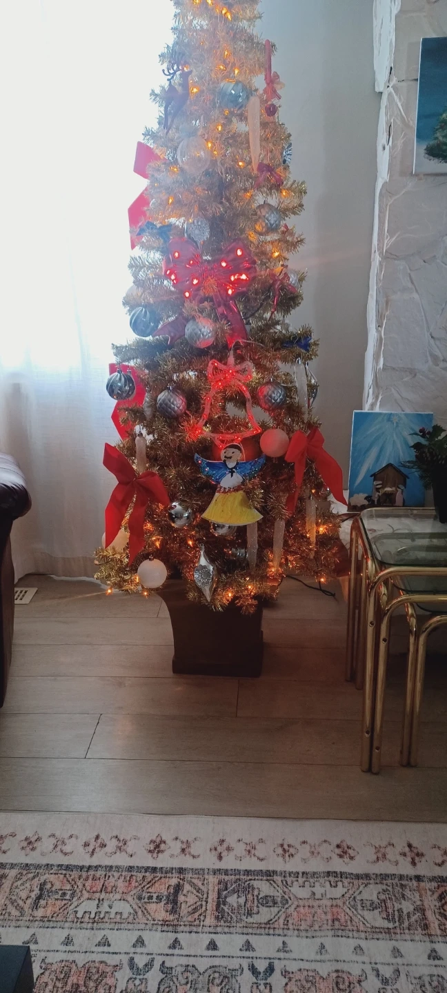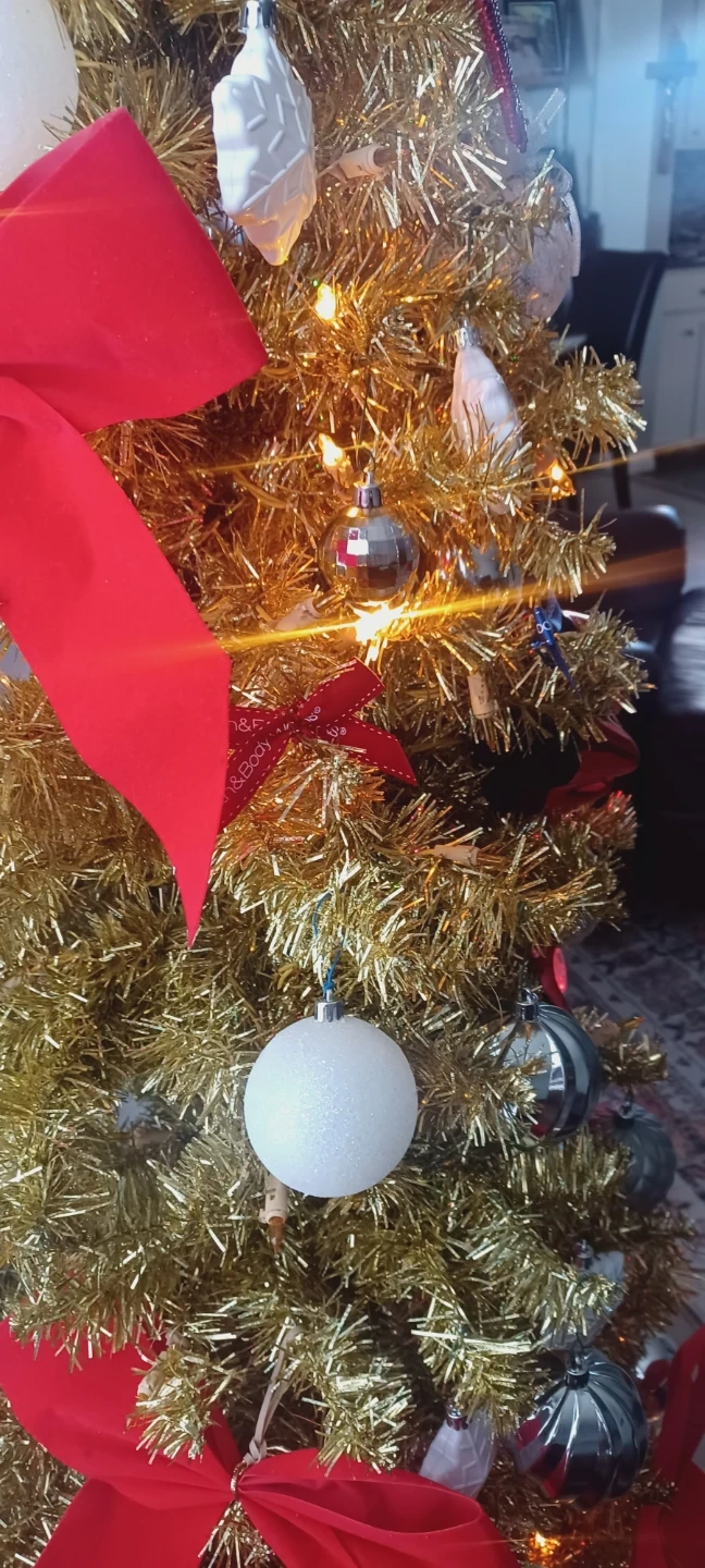 Selling a pre-decorated gold Christmas tree! It comes with a variety of ornaments and red bows , all lights included.