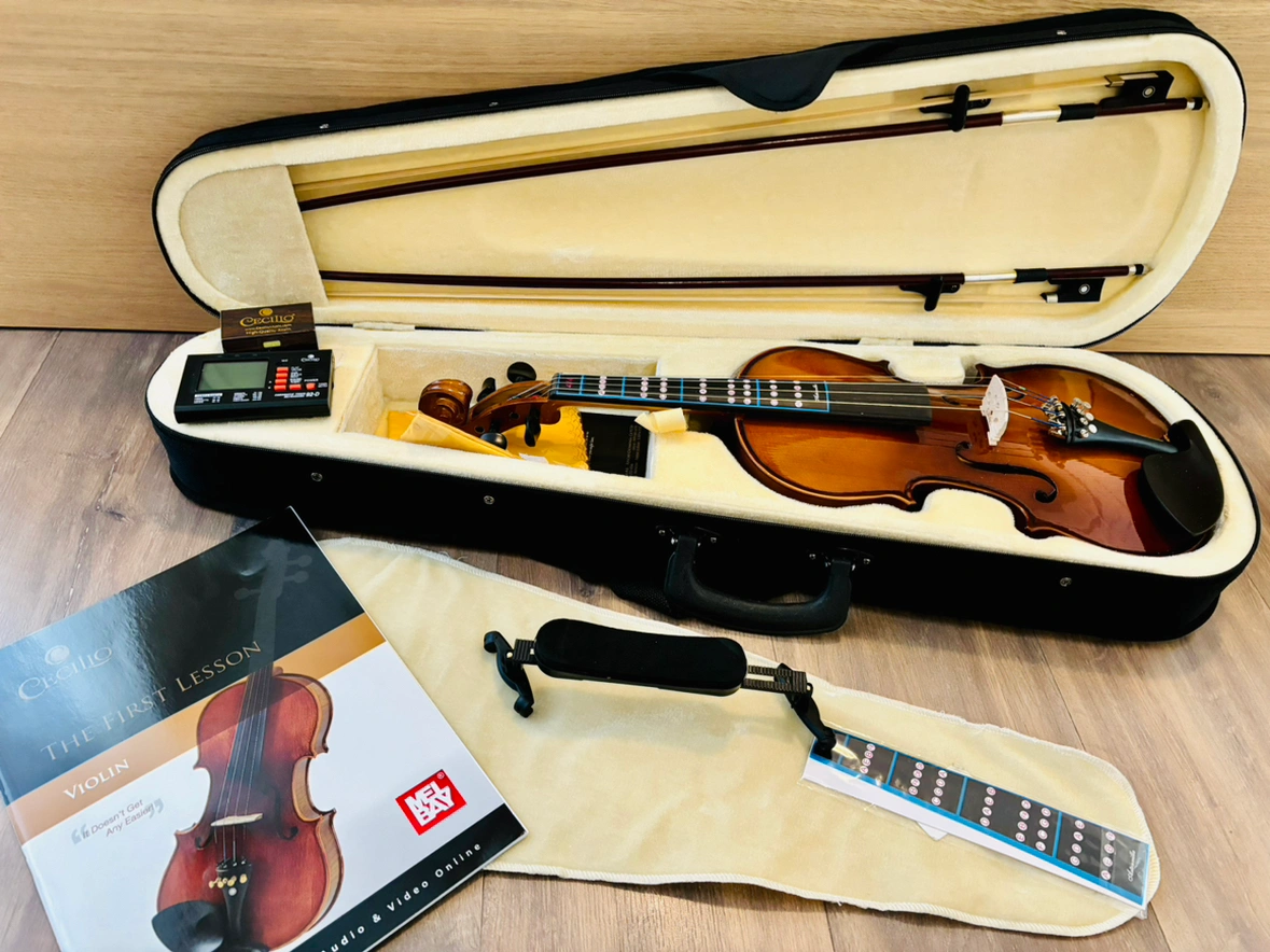 Includes 2 bows, violin, shoulder rest, a box of rosin, and a tuner. Also includes new violin cleaning cloth, extra bridge and an introductory music book and a violin sticker.
