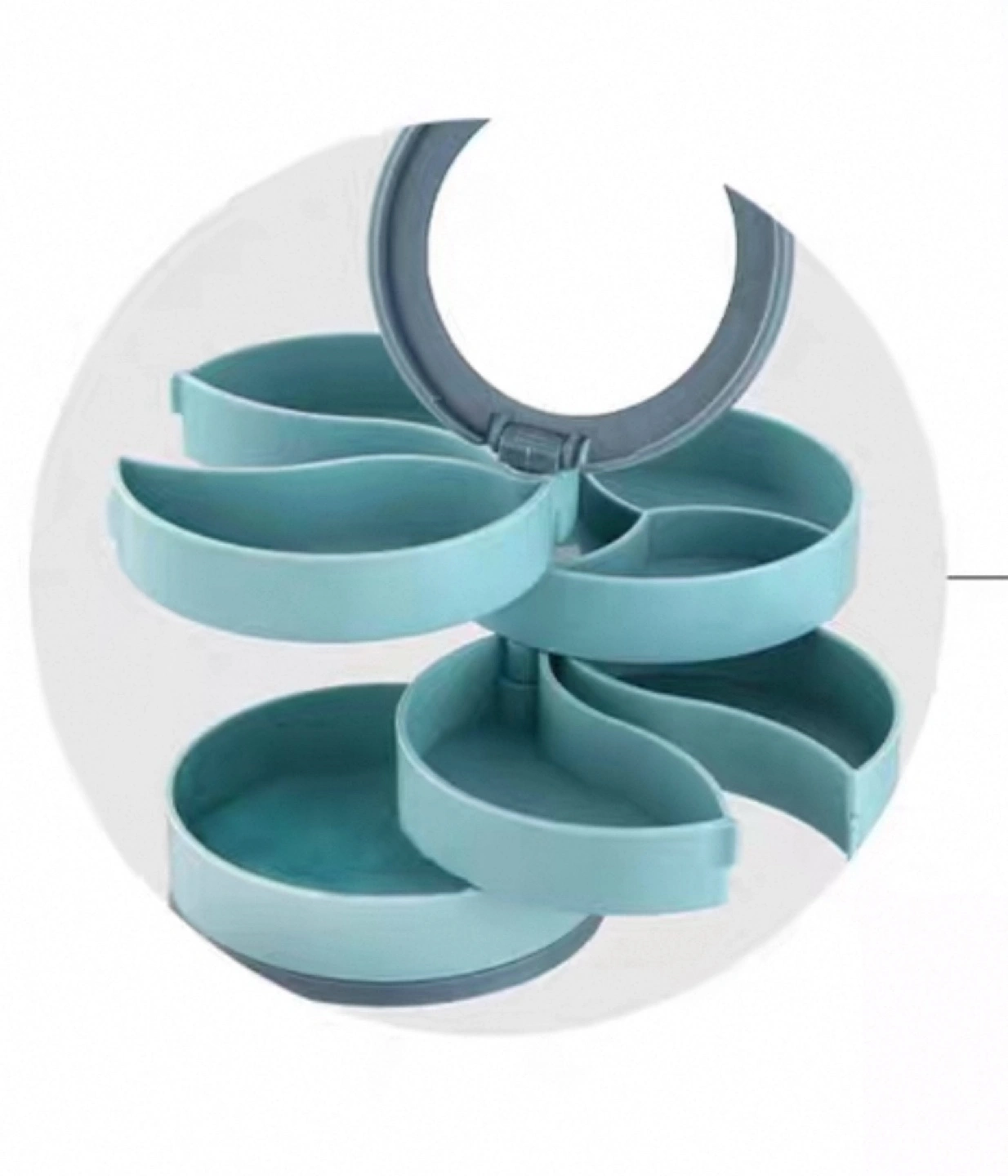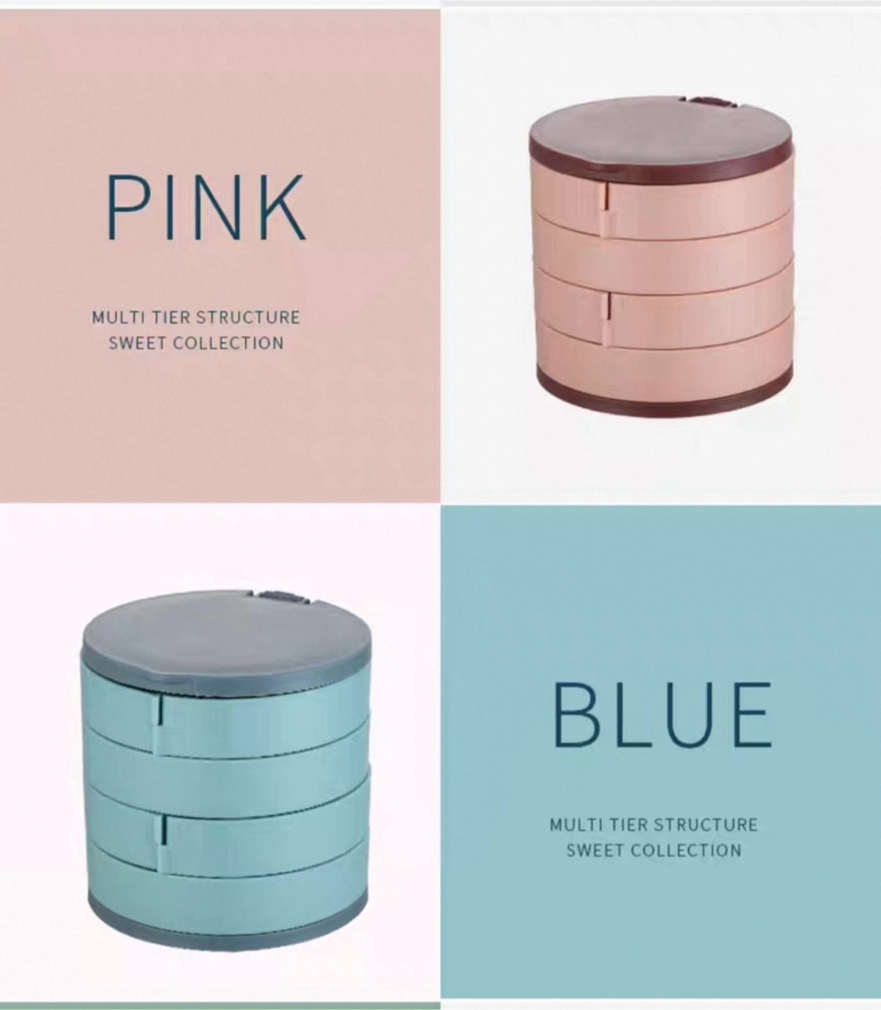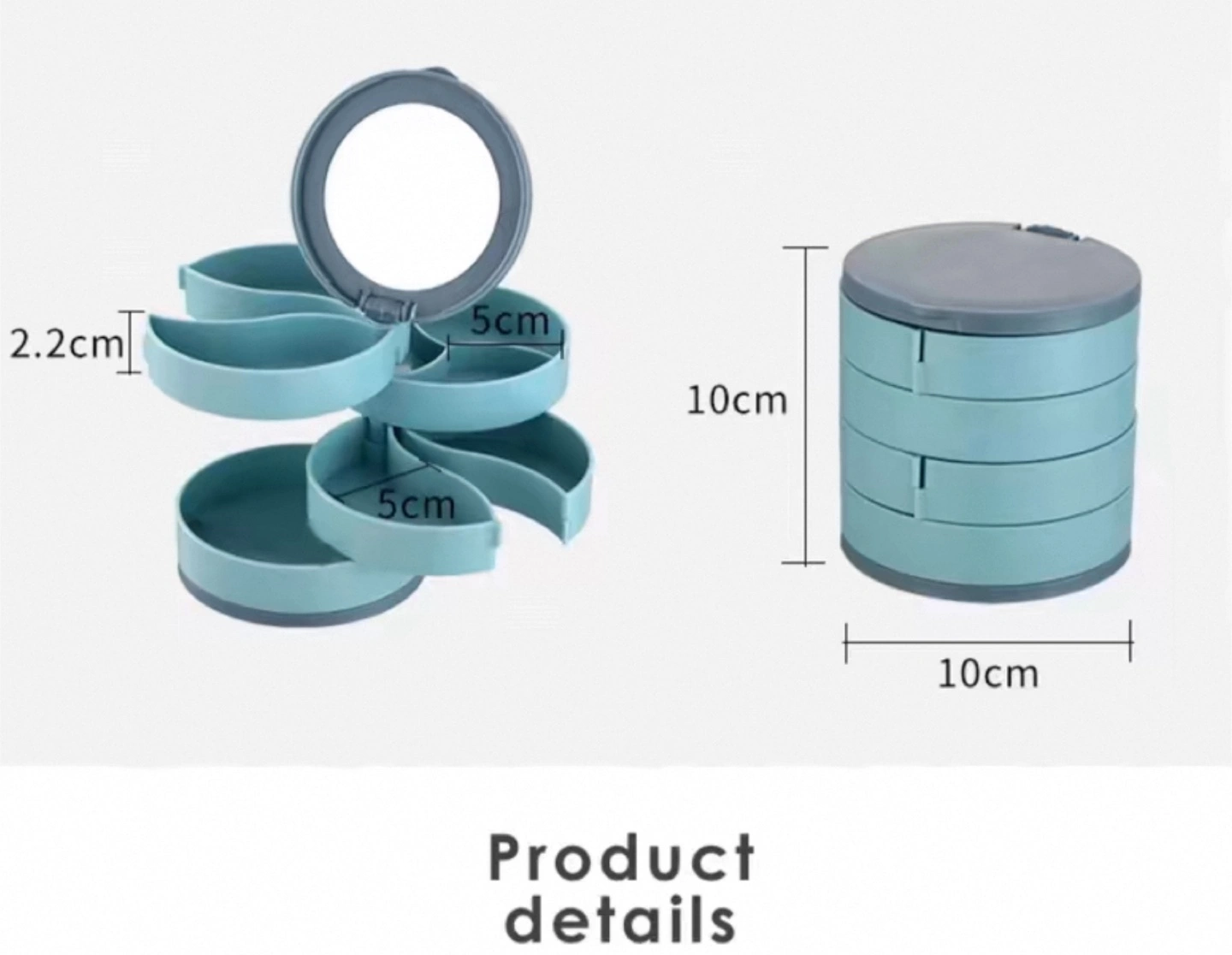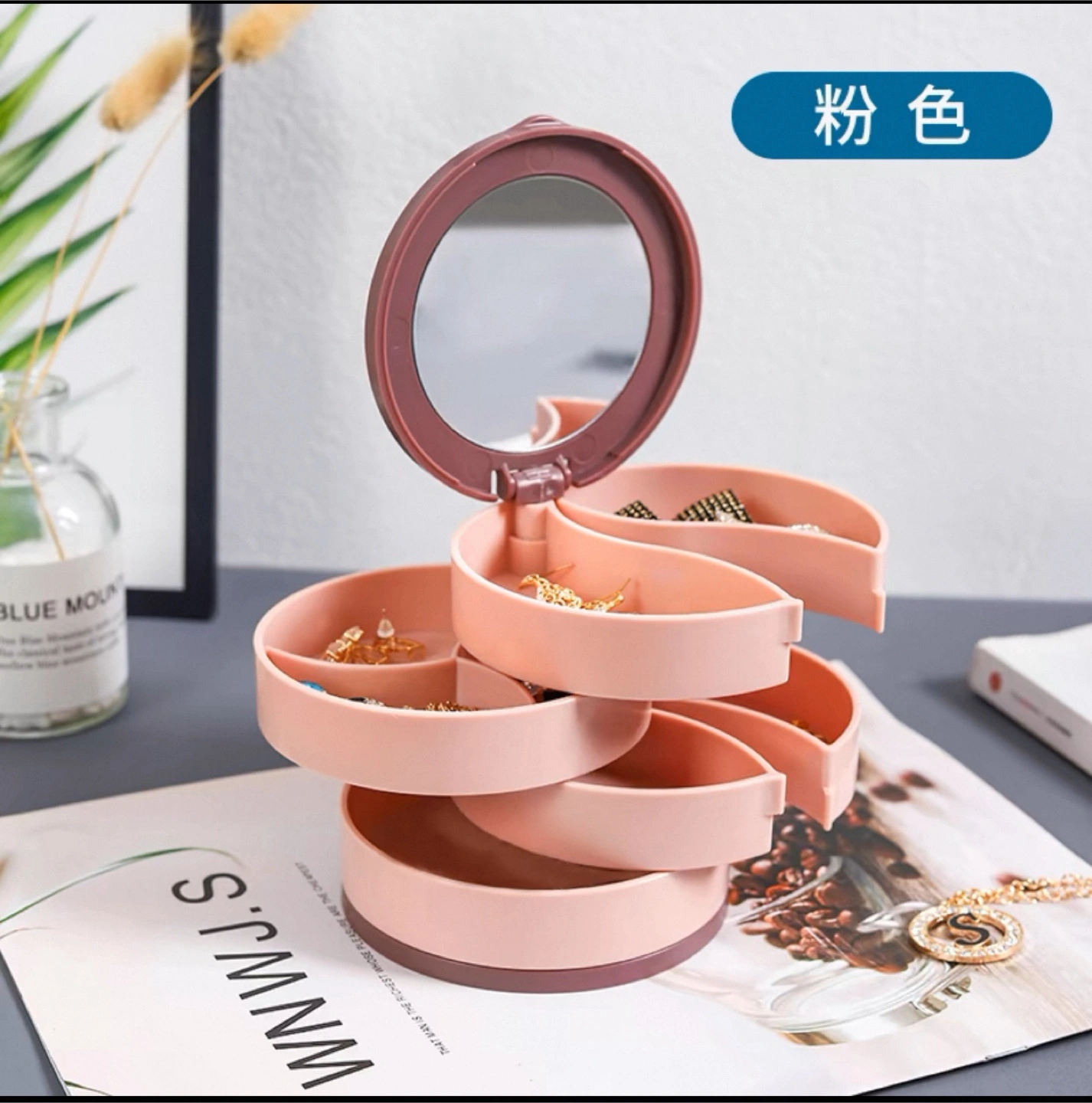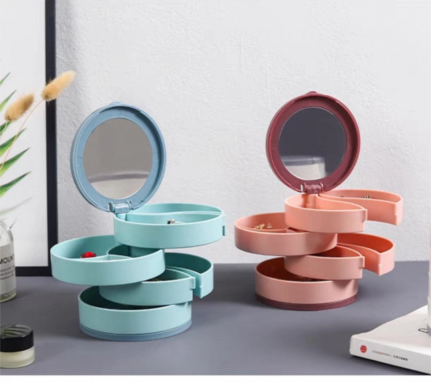 Multi-tiered rotating jewellery box. Features multiple compartments and a built-in mirror. Compact design, ideal for storing earrings, rings, bracelets, and necklaces. Available in blue and pink.