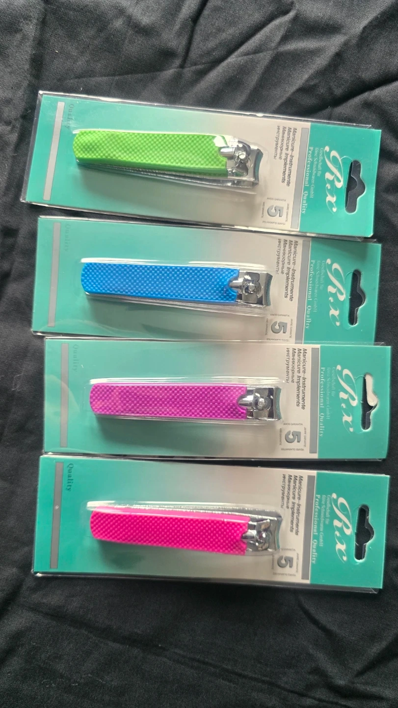 Four Rx nail clippers, each in a different colour including pink, purple, blue, and green. They're made with stainless steel for durability. These manicure instruments are designed for professional quality results.