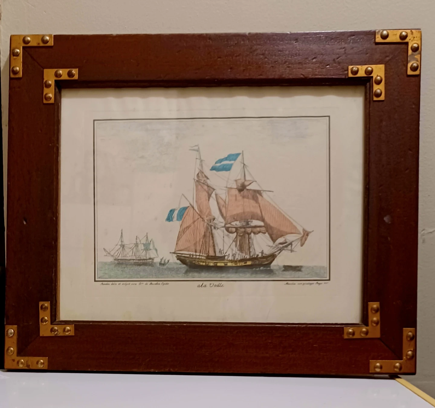 Frame: The piece is housed in a distinctive dark wood frame with brass corner reinforcements, which is characteristic of campaign or nautical-style decor meant to protect items during travel.
