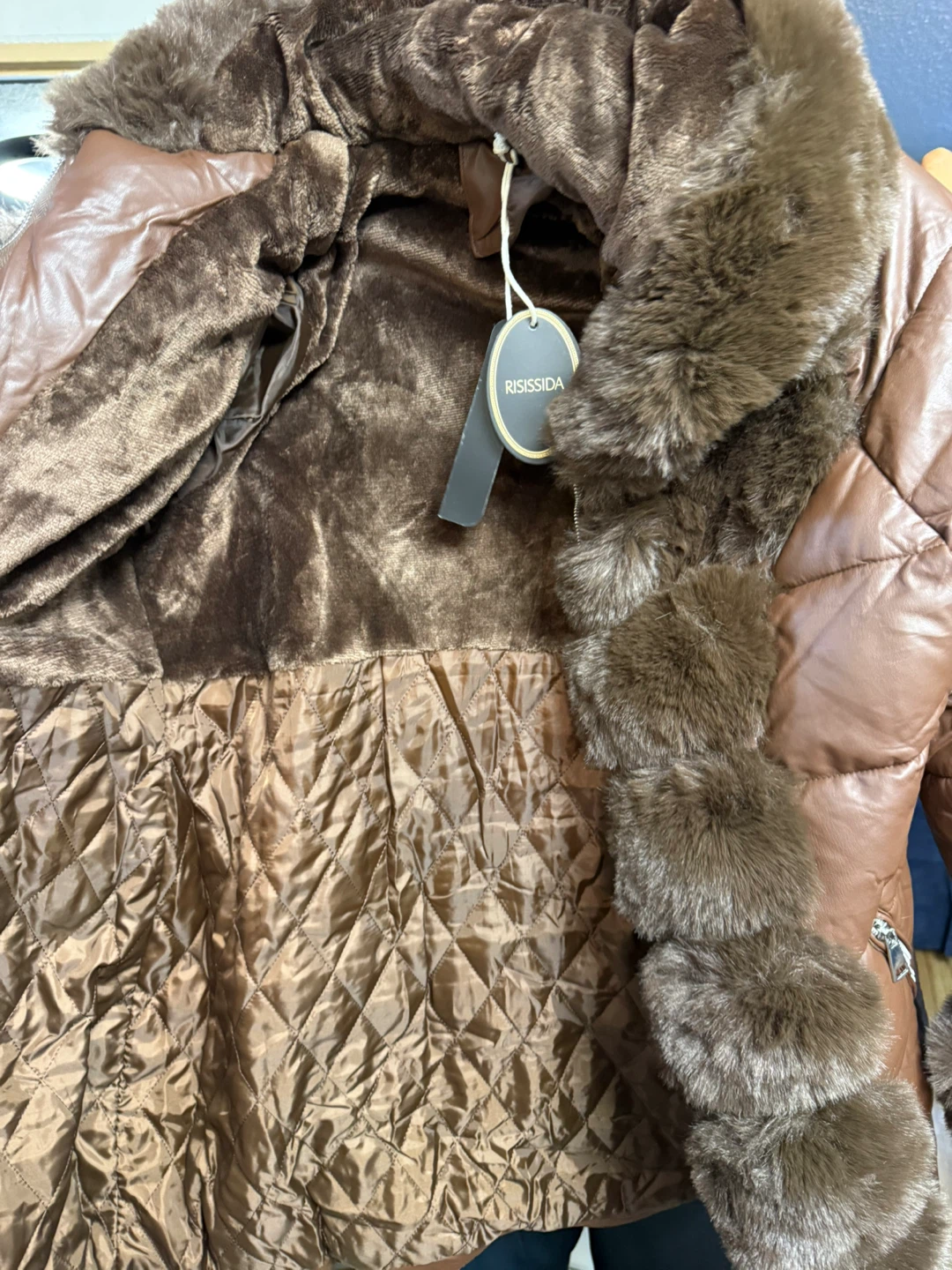 This RISSSIDA jacket is a stylish brown puffer with a faux leather exterior and cozy faux fur trim. It features a quilted lining and a zip-up front. It's a warm and fashionable outerwear piece.