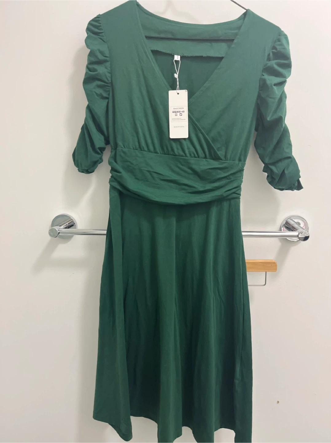 This is a brand new HALCYEEN dress in a beautiful green colour! It features a stylish ruched design and is made from a comfortable blend of 60% polyester, 35% cotton, and 5% spandex. The dress is size small and comes with its original tag.