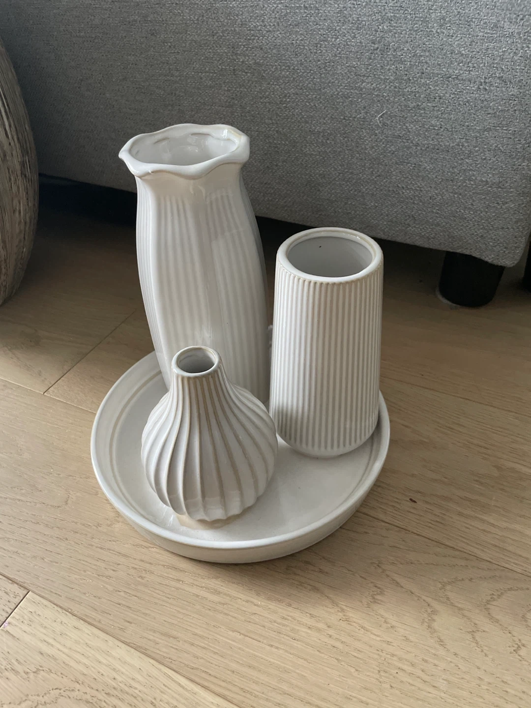 Selling a lovely set of white ceramic vases. They're in great condition and would look beautiful in any room. Includes three vases of different shapes and sizes, arranged on a matching tray