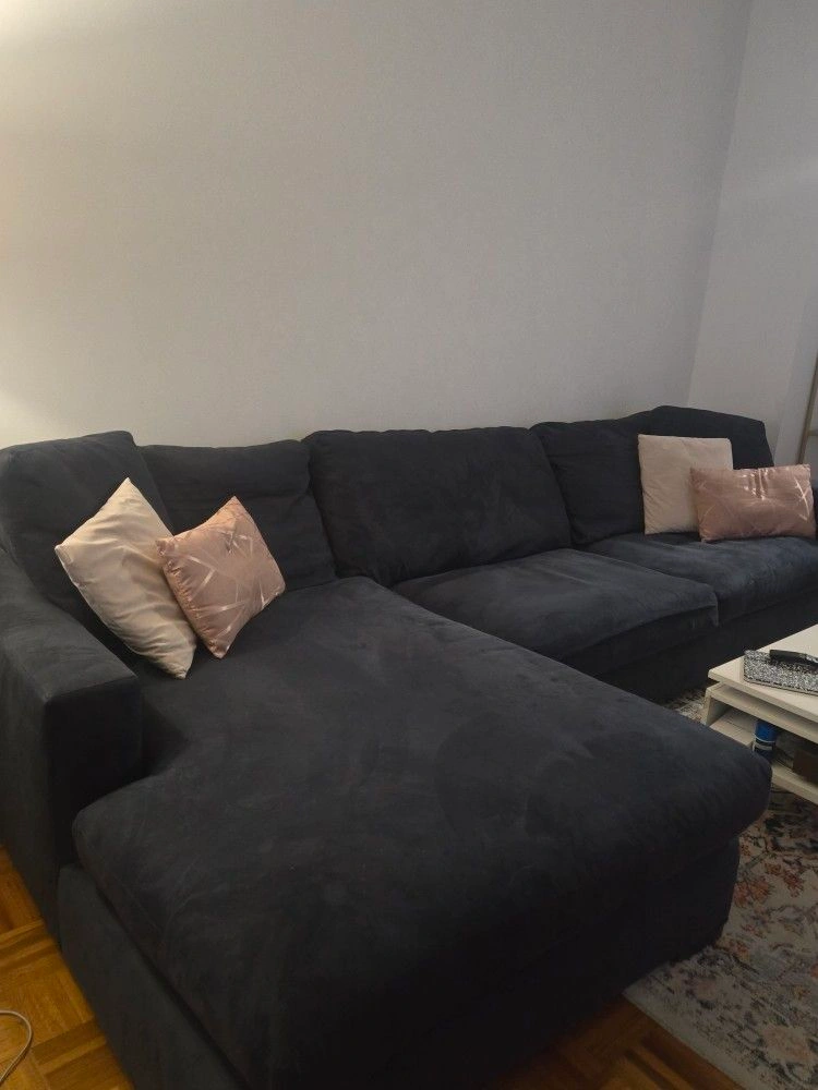 Gently used Room & Board Metro sectional with a timeless, modern design. It offers deep seating and luxurious comfort. The classic navy-blue microfiber suede is stylish and pet/kid-friendly, perfect for NYC living rooms. This sectional provides generous seating without taking up too much space. Known for its comfort and craftsmanship, this Room & Board Metro piece originally retailed for $2,699. Pick up only in Wall Street, NYC. Pillows included!