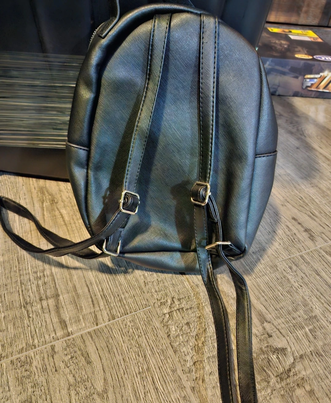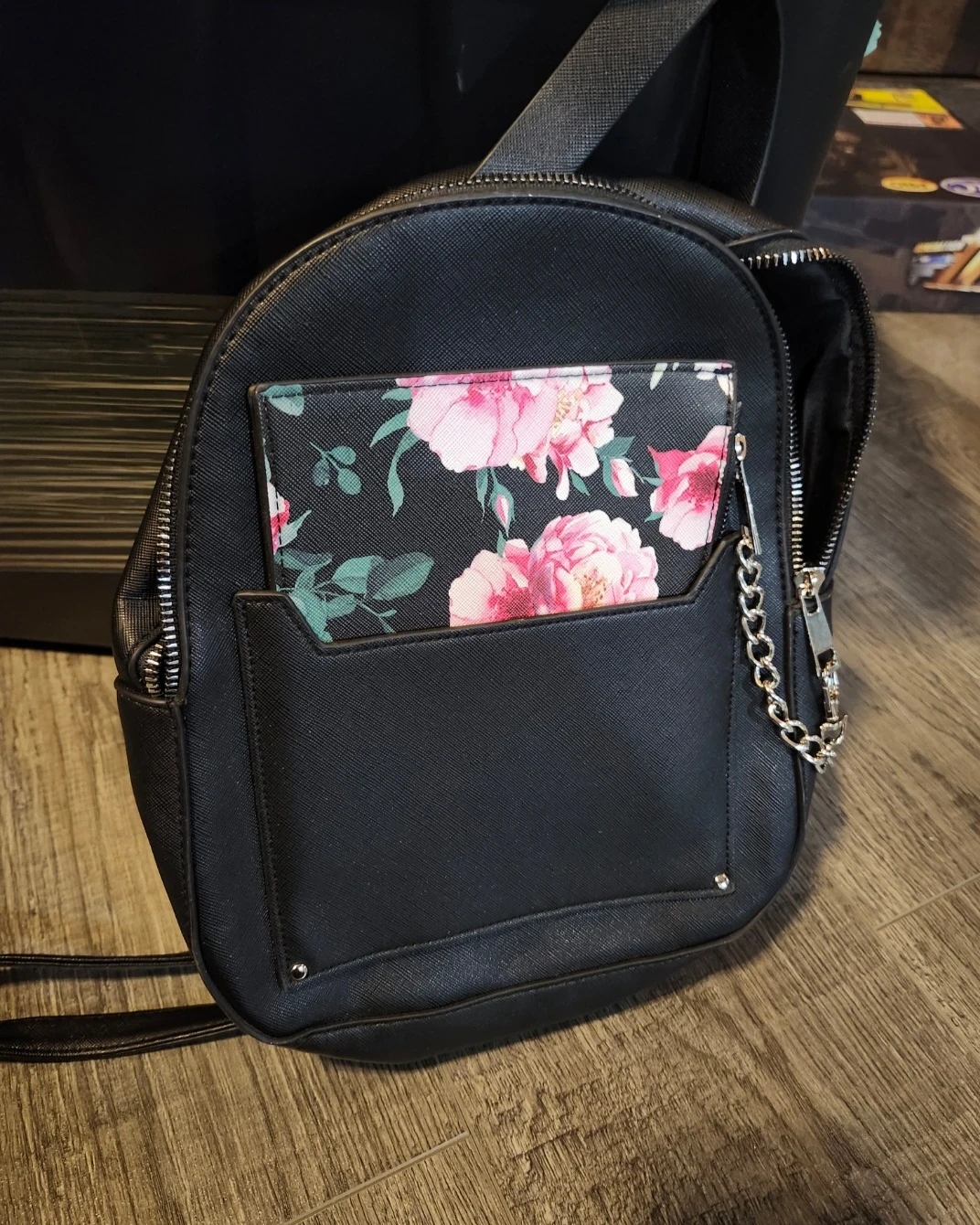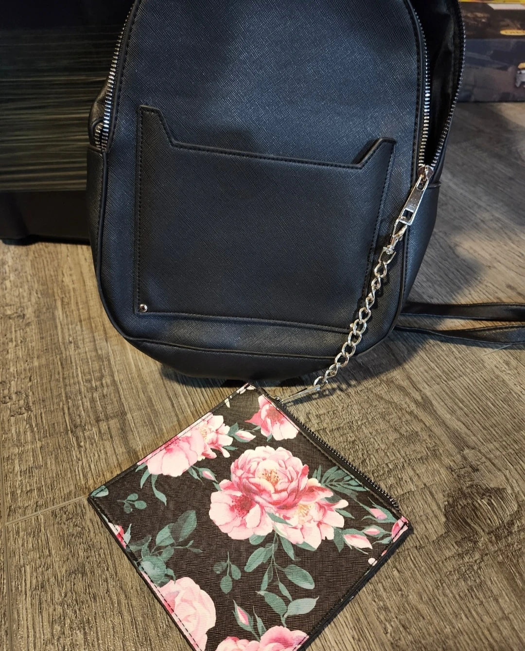 This black faux leather mini backpack comes with a matching floral print pouch. It's got a front pocket with a chain detail. It's a stylish option for carrying your essentials!