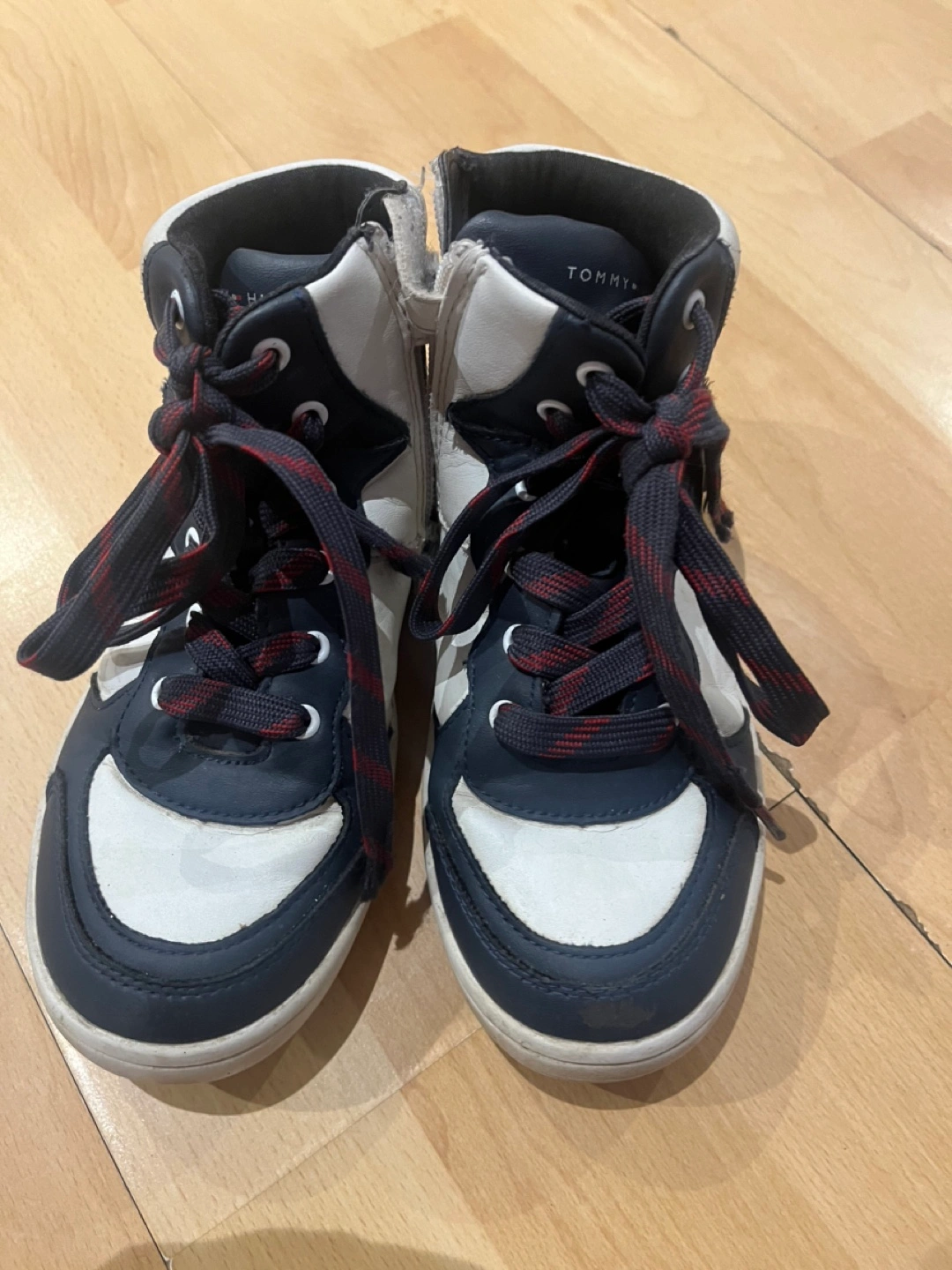 Tommy - White and blue high top sneakers. Lace up closure. Zipper on the side. Red and white laces.